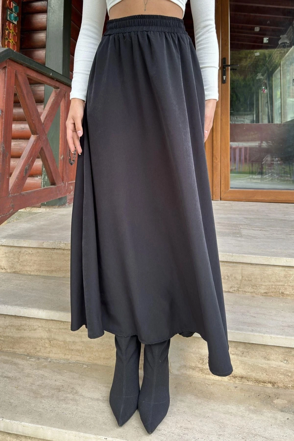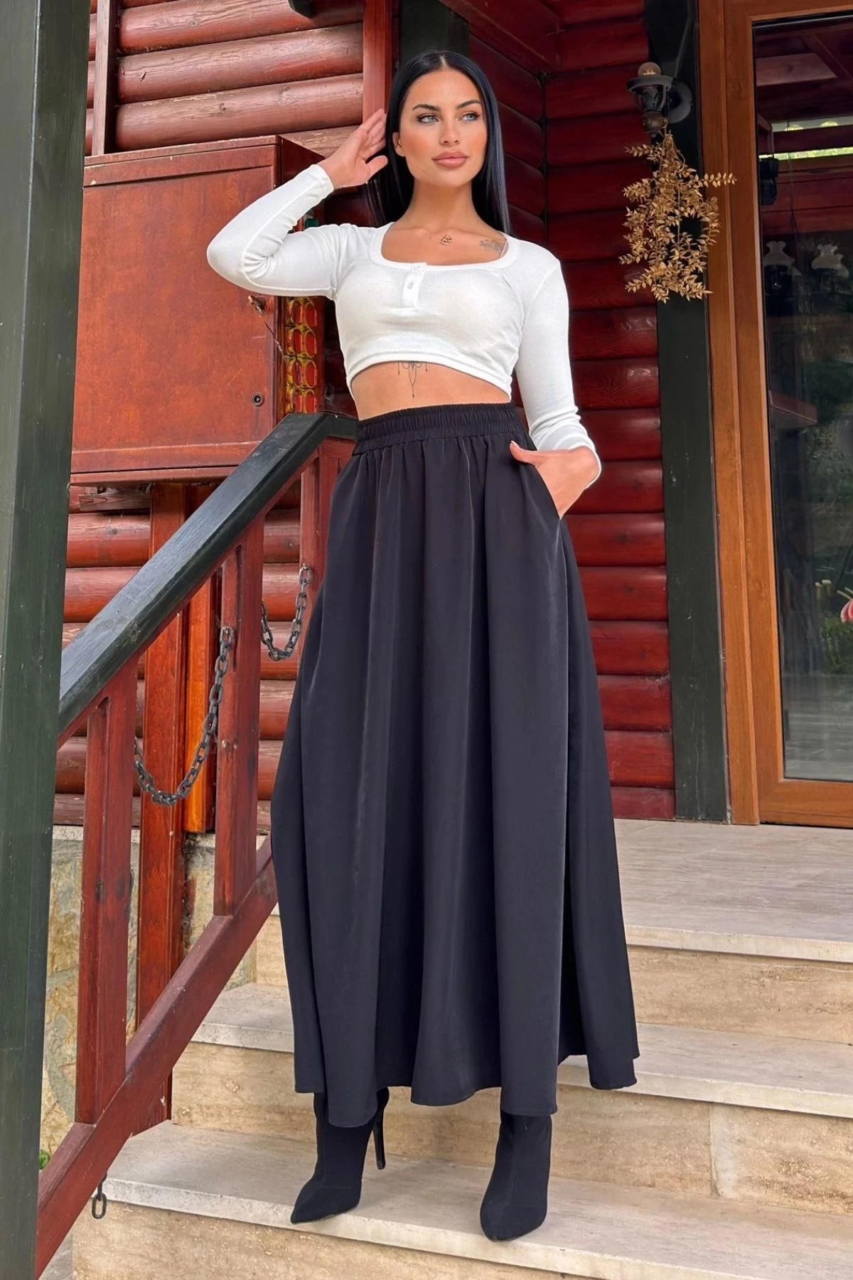 Siyah Lastikli Yüksek Bel, A Kesim, Dökümlü Ve Salaş, Uzun Kupra Etek