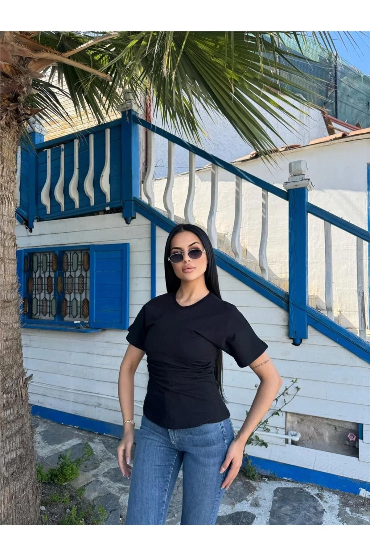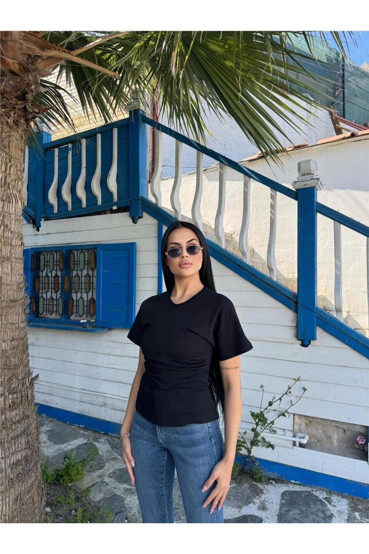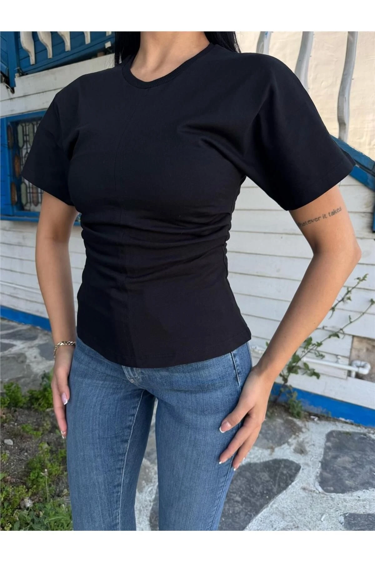Siyah Pamuklu Yandan Büzgülü Bluz