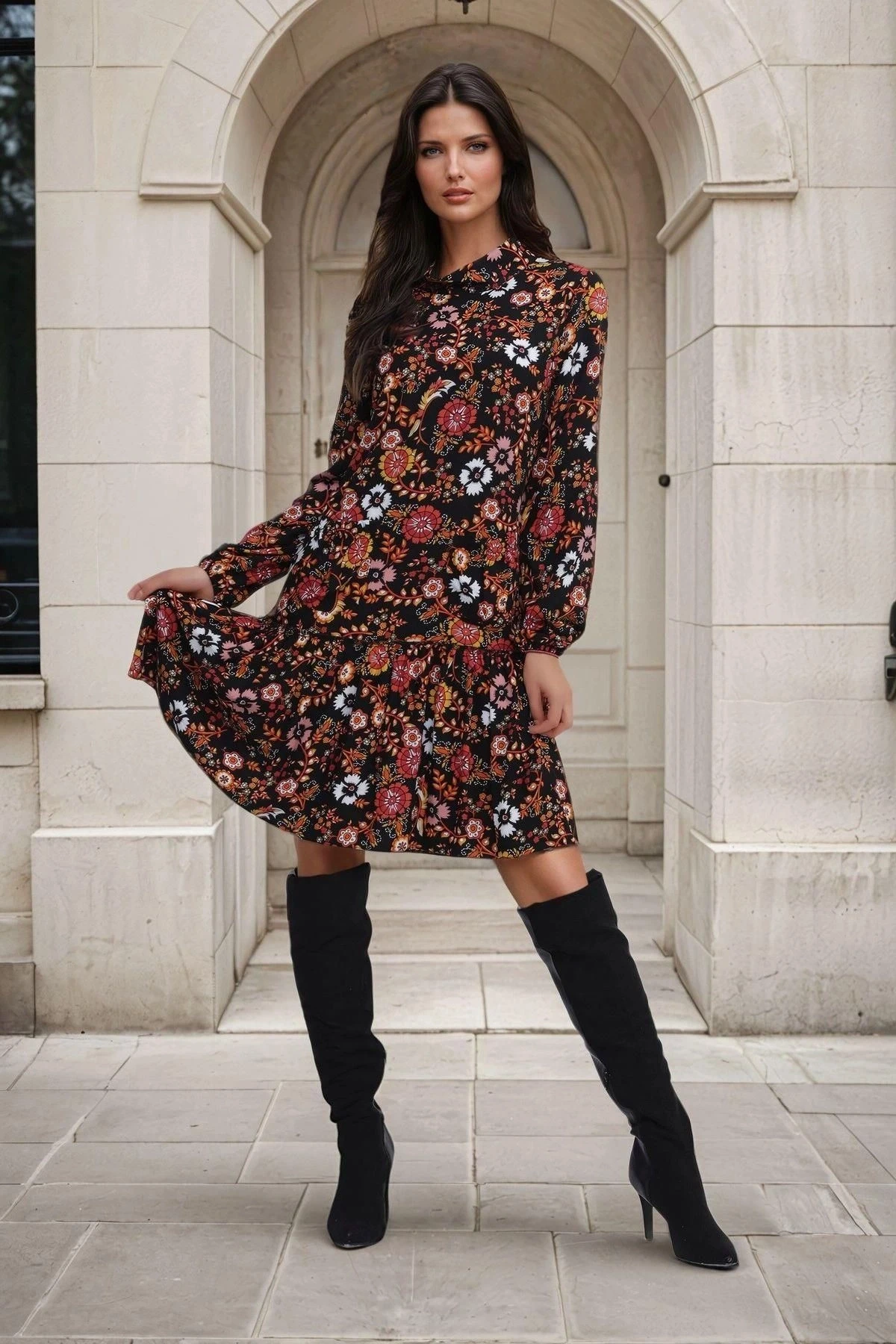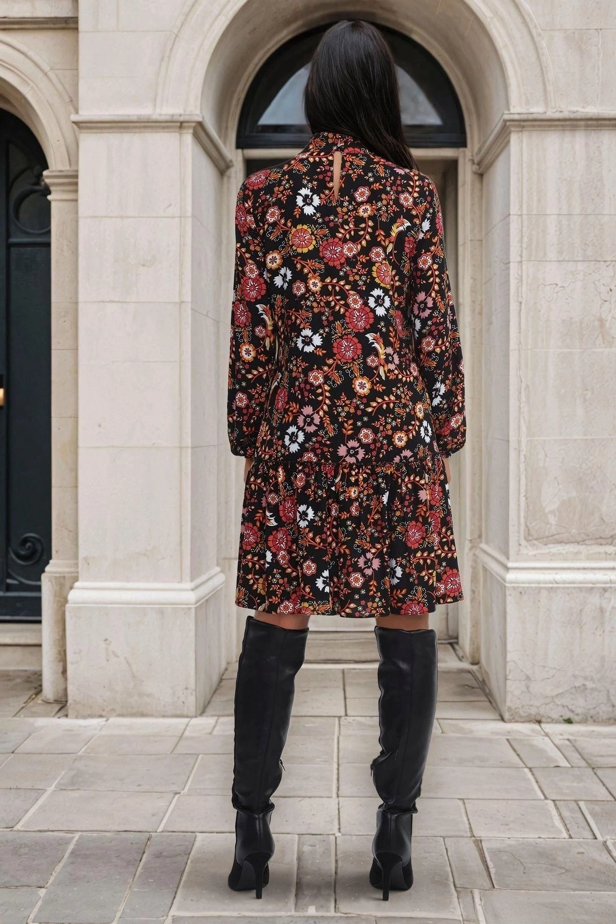 Siyah Sarı, Çiçek Desenli, Dik Yaka, Uzun Kollu Elbise