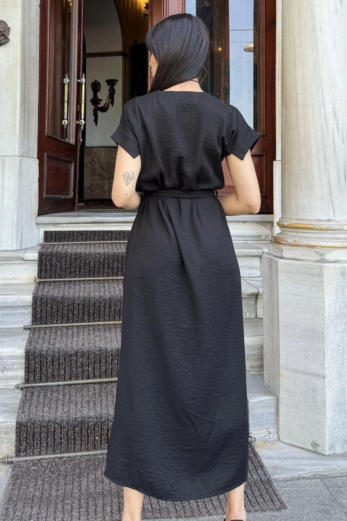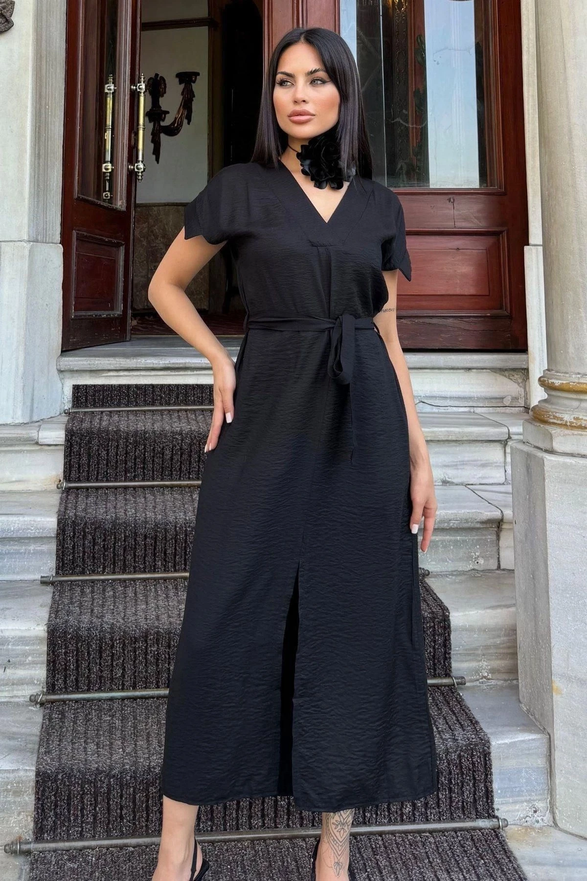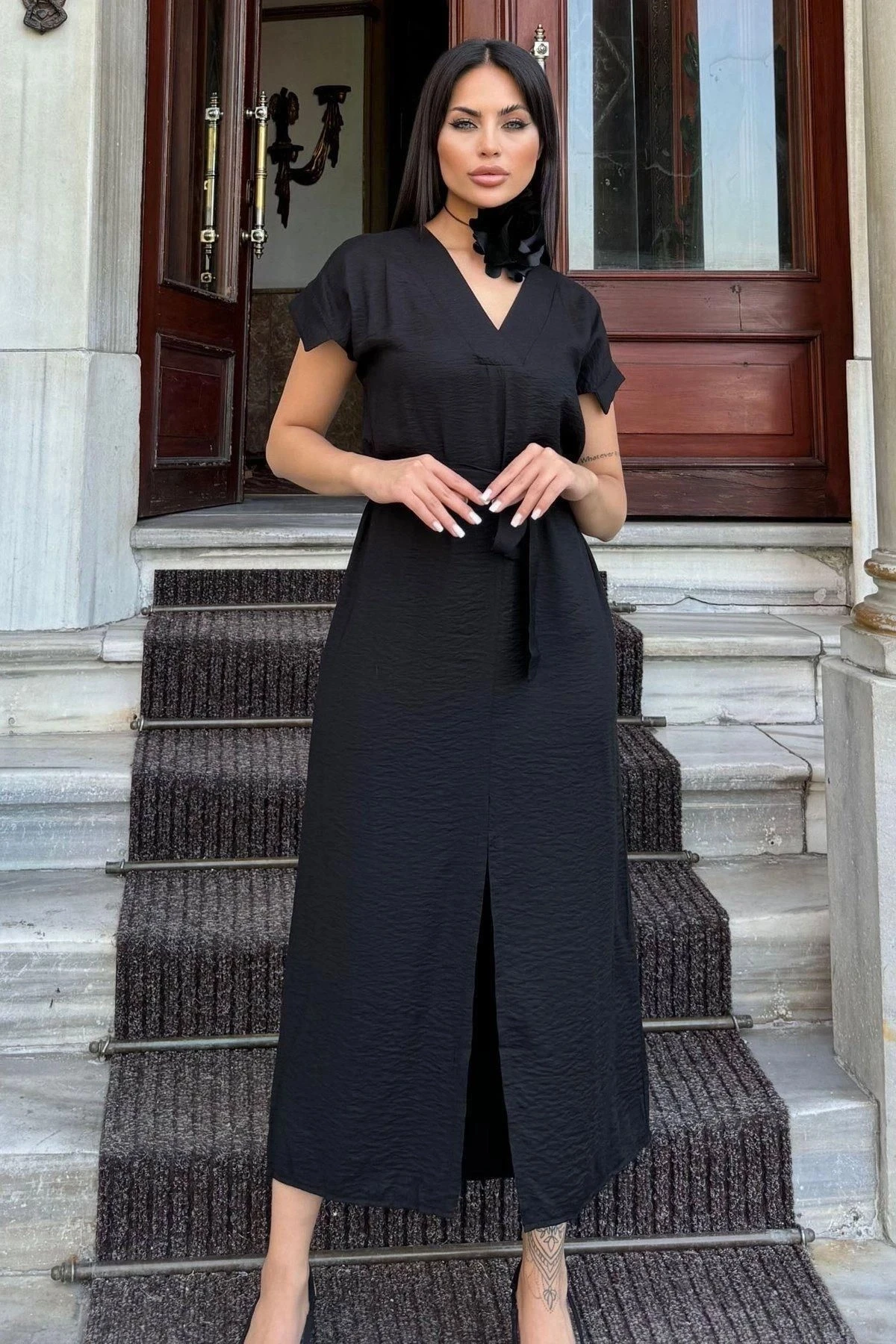 Siyah V Yaka, Kısa Kol, Airobin Kumaş, Omuz Detaylı, Kemerli/Kuşaklı, Önden Yırtmaçlı Maxi Elbise