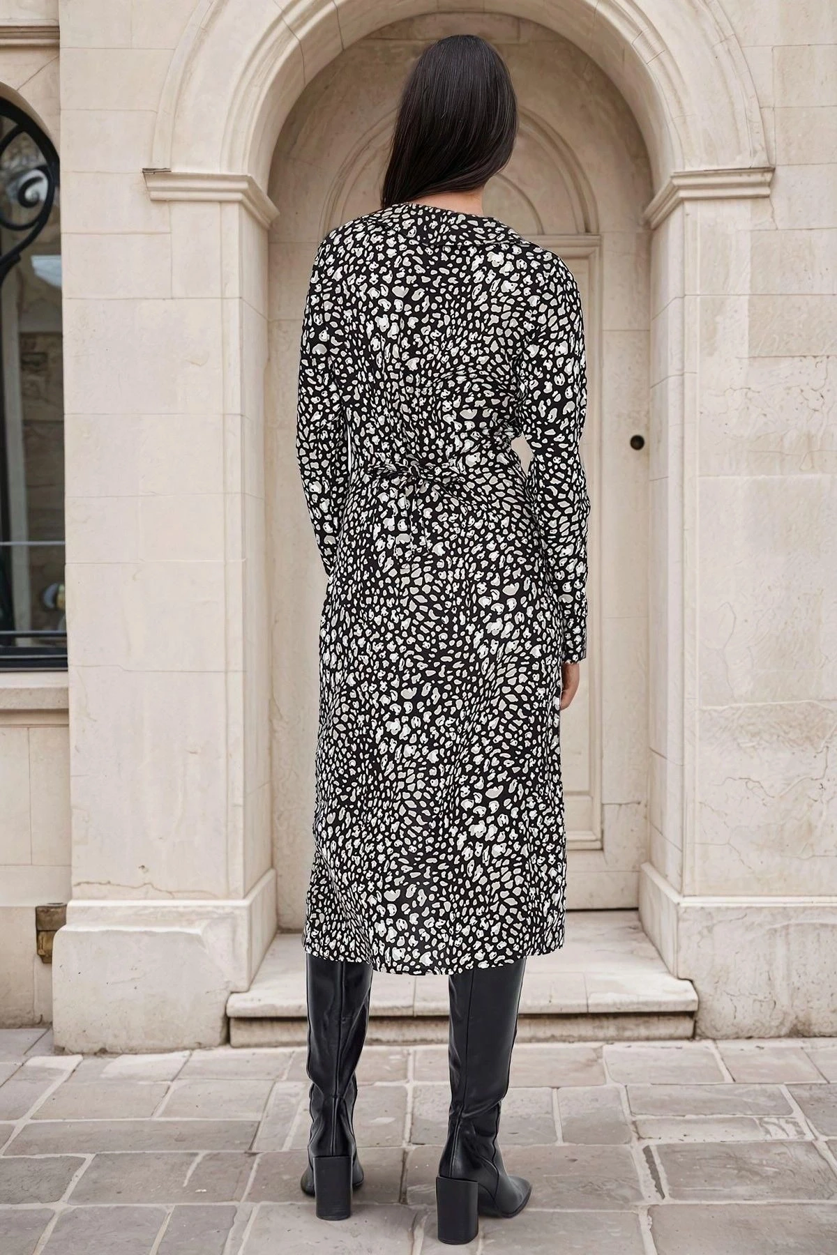 Siyah V Yaka, Leopar Desenli, Yırtmaçlı, Uzun Elbise