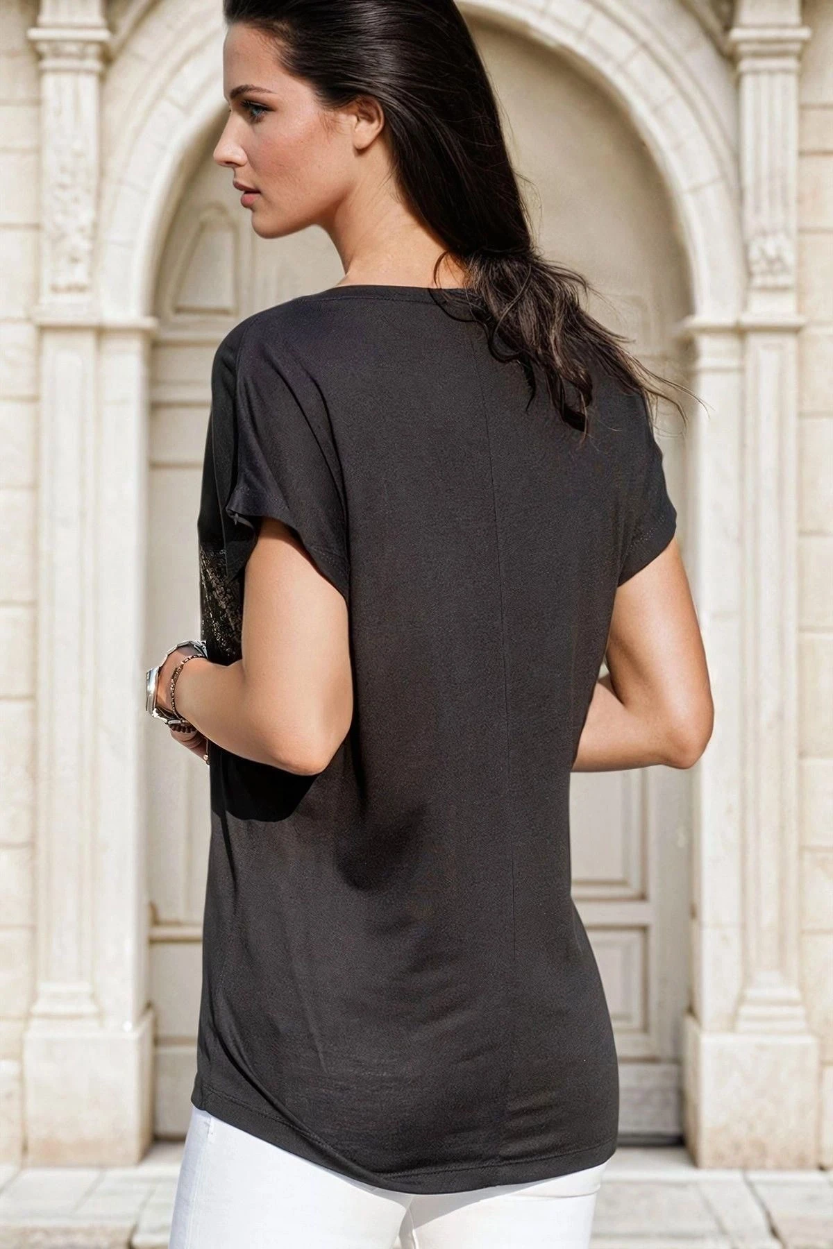 Siyah V Yaka, Payet Cep Detaylı, Basic Bluz