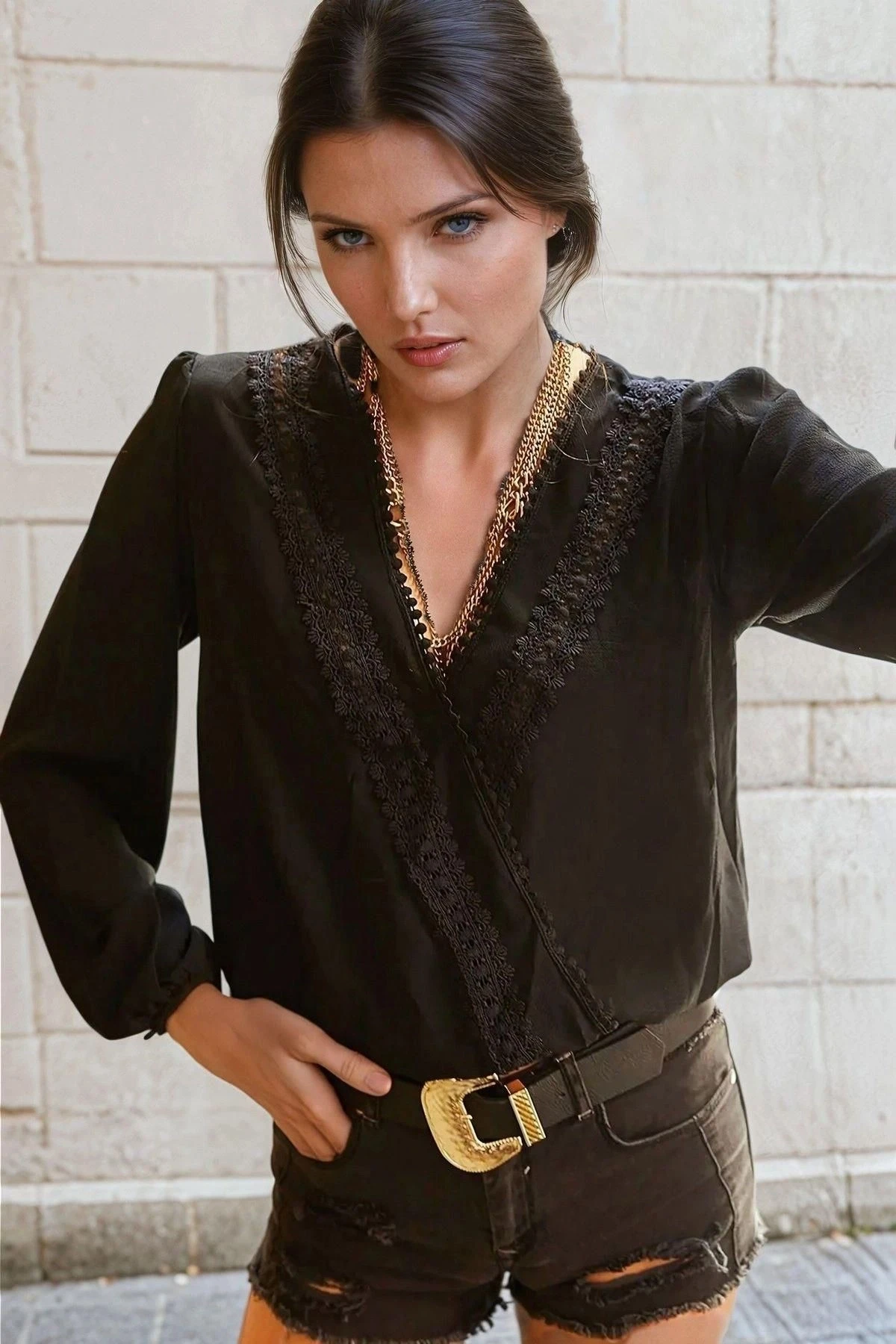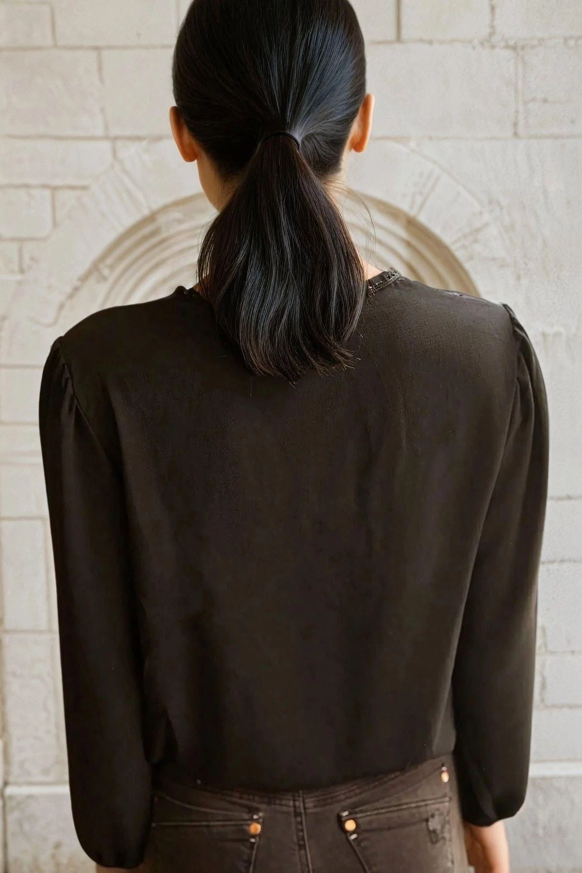 Siyah Yakası Güpürlü, Kolları Lastik Detaylı, Uzun Kollu Bluz
