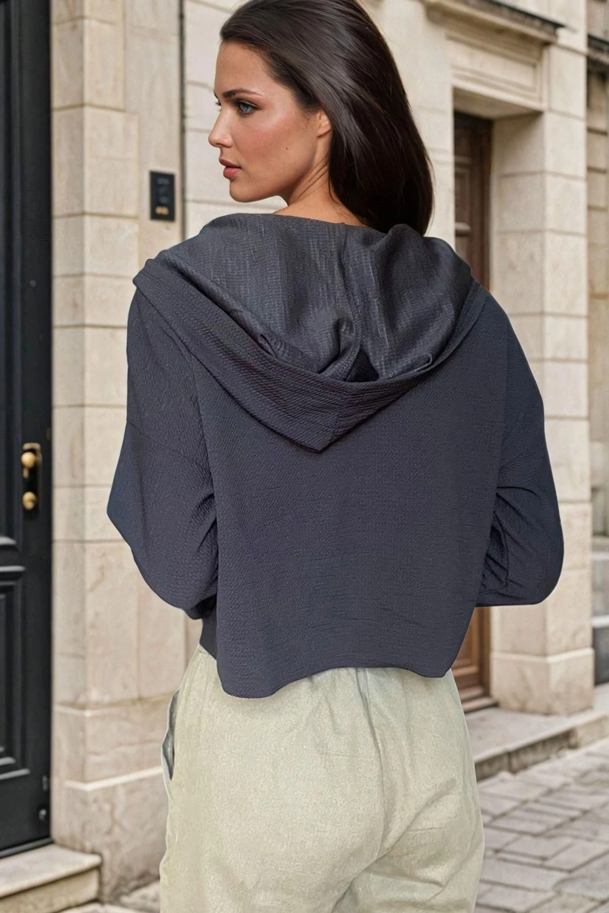 Siyah Yarım Fermuarlı, Kapüşonlu, Casual Bluz