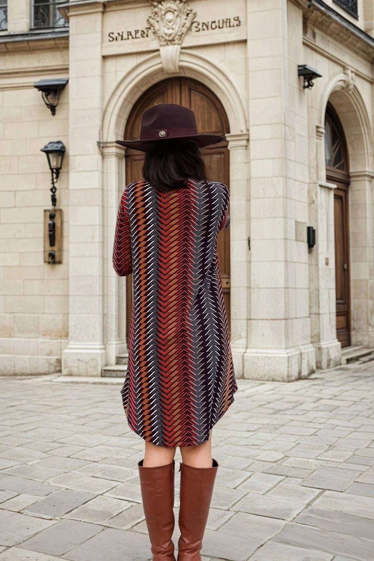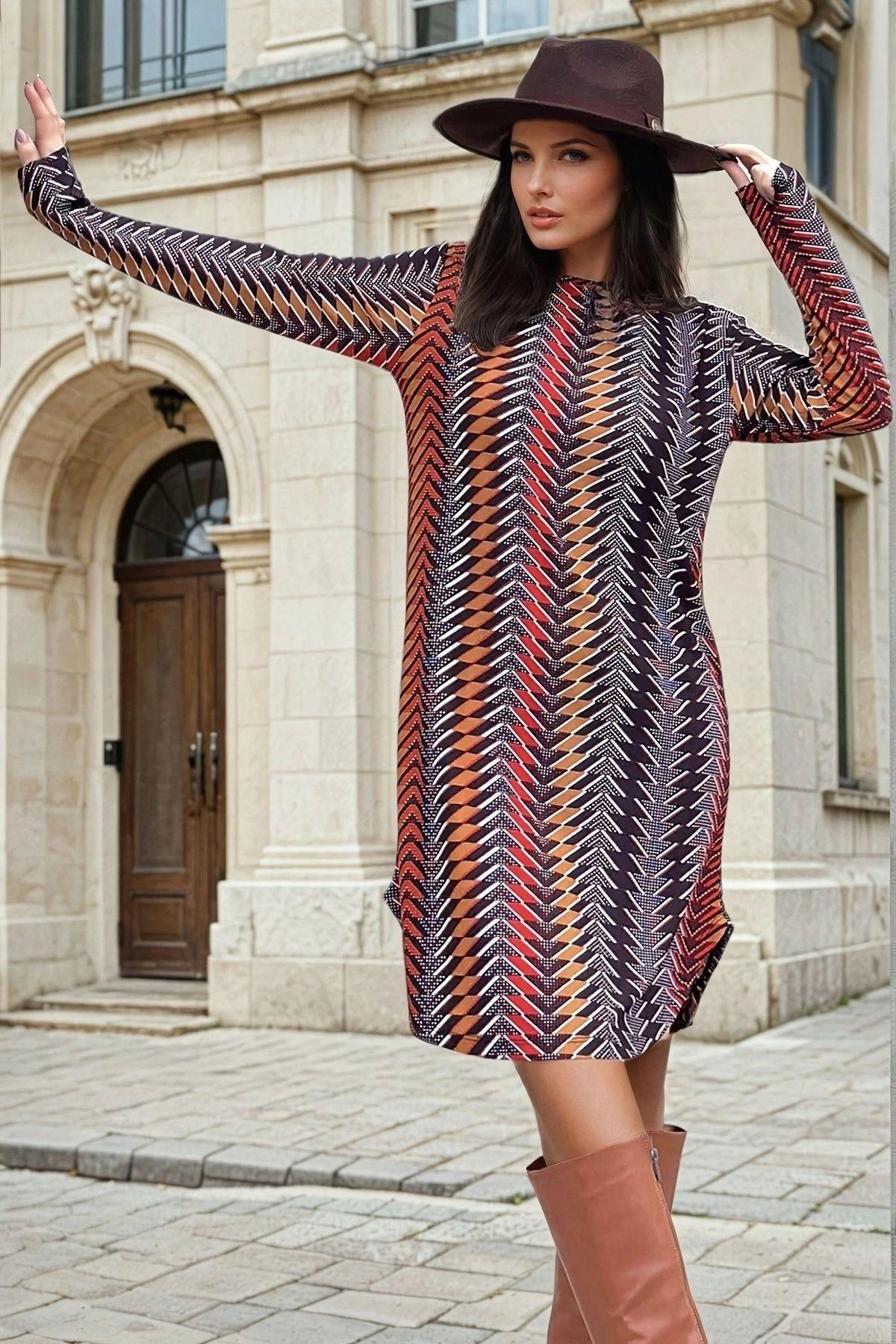 Siyah Yuvarlak Yaka, Geometrik Desenli, Midi Elbise