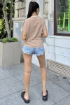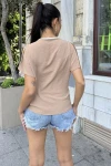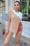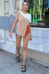 Taba & Bej Kısa Kollu, Renk Bloklu Asimetrik Kesim, Omuz Ve Fermuar Detaylı, Salaş Airobin Bluz
