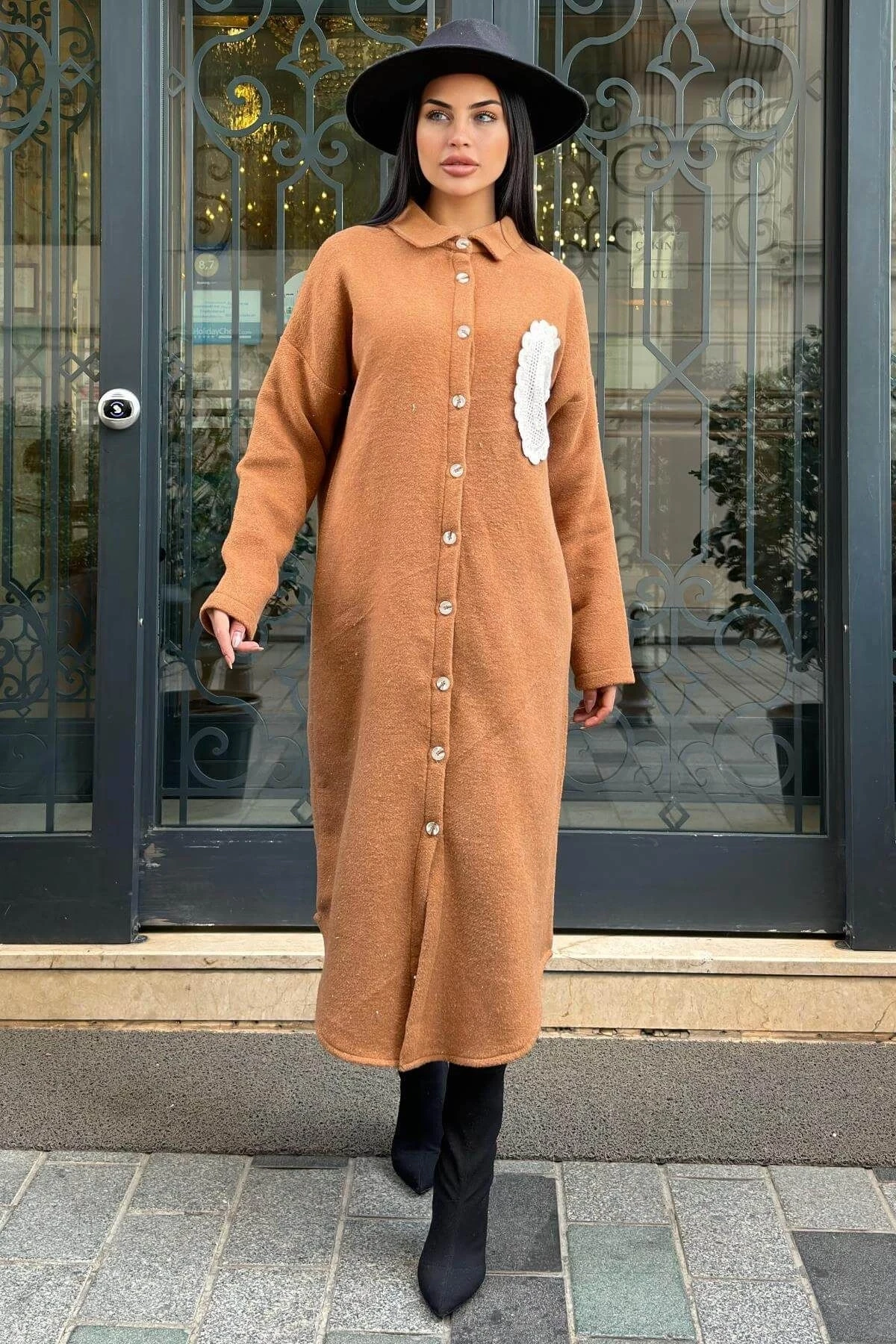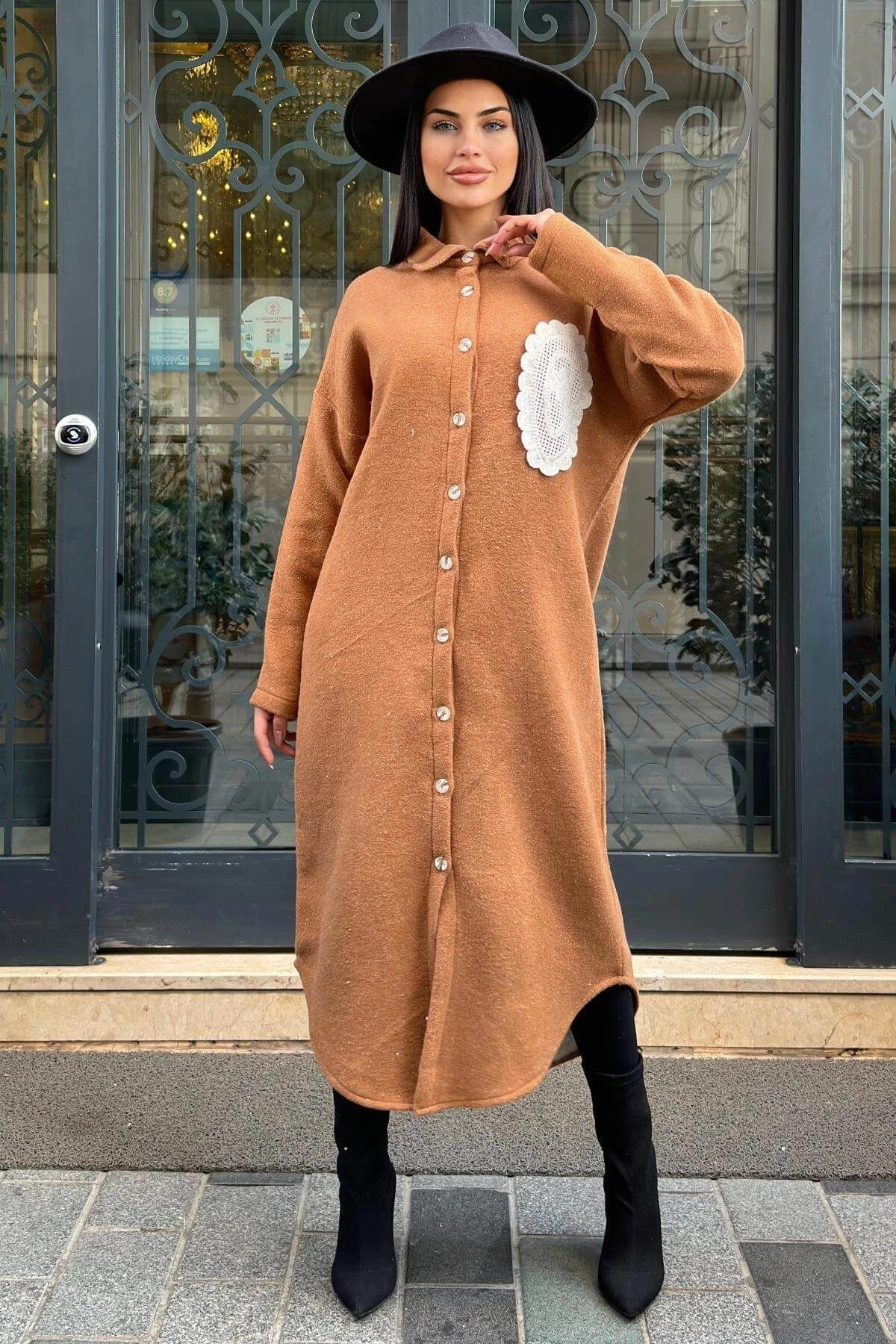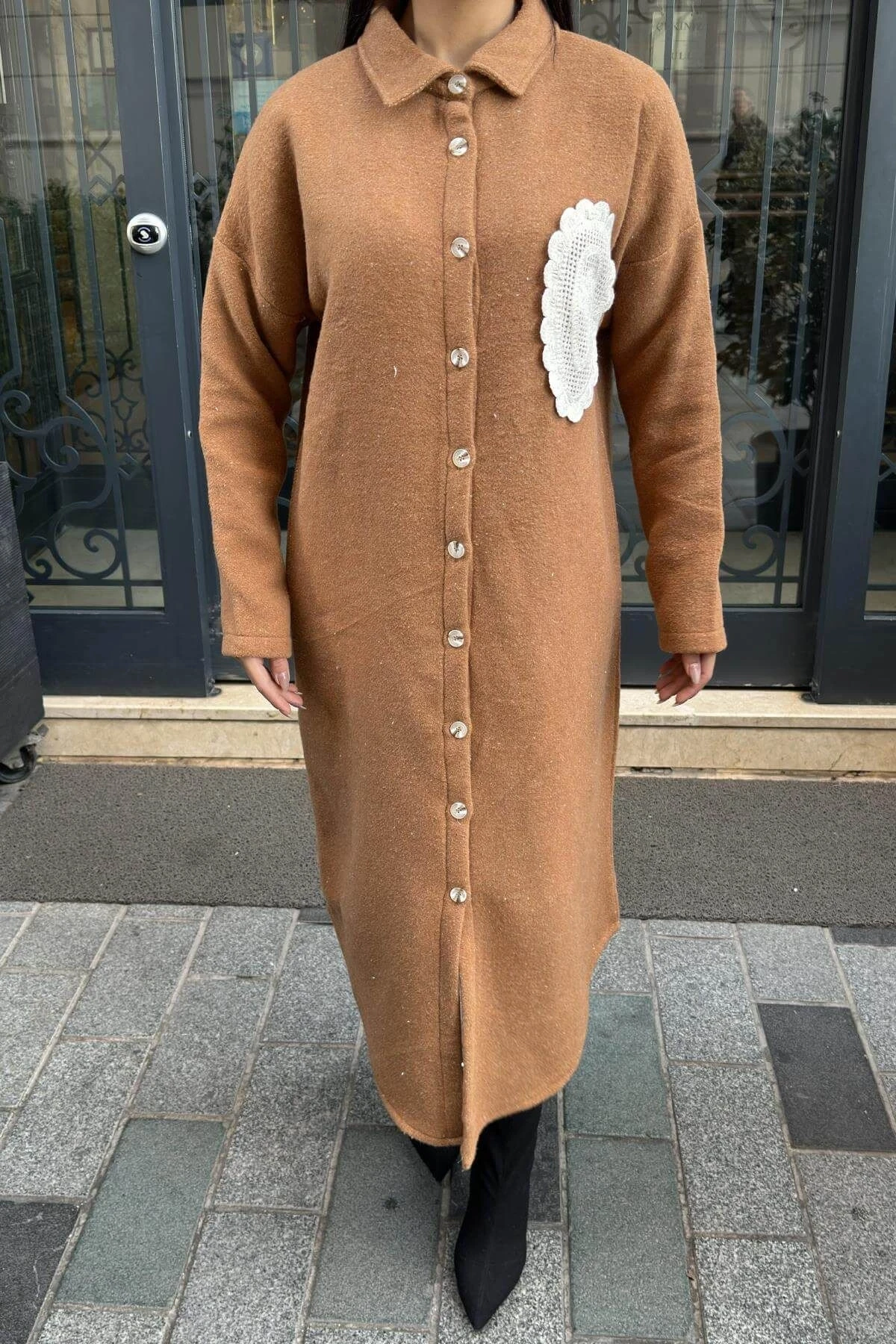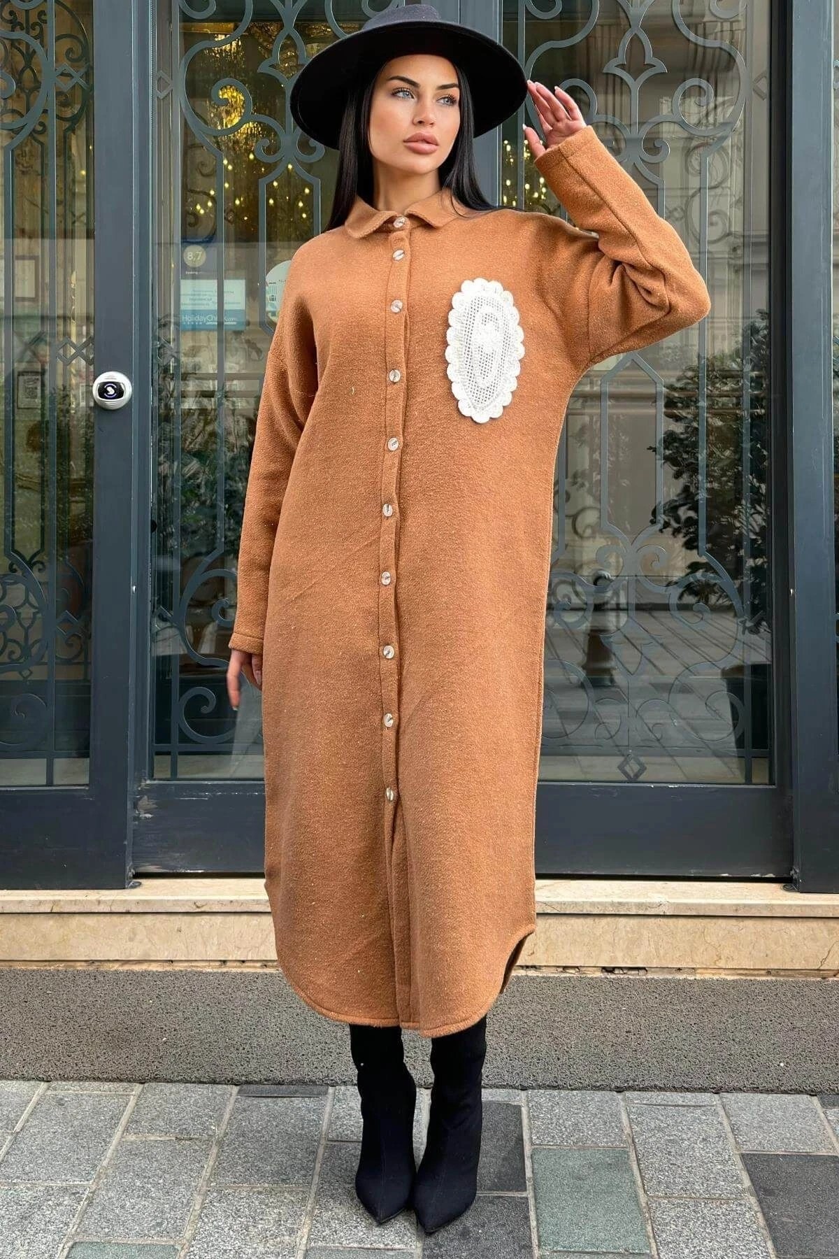 Taba Çift Taraflı Yumoş Dokulu, Aplike Detaylı, Duble Kaşe Gömlek Elbise