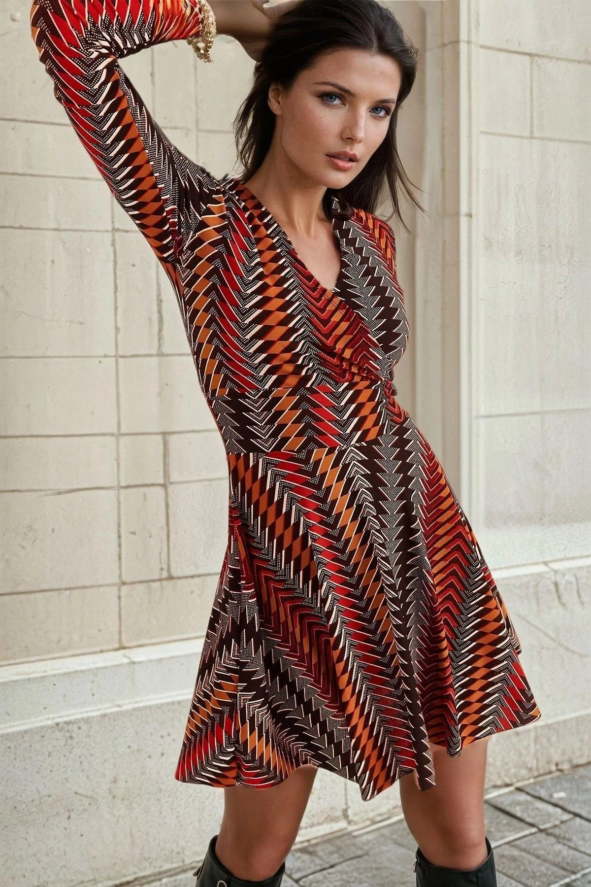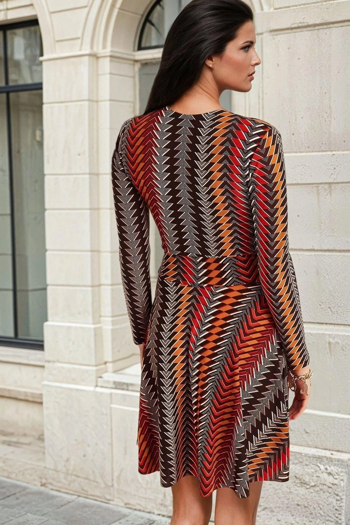 Taba Kruvaze Yaka, Geometrik Desenli, Midi Elbise
