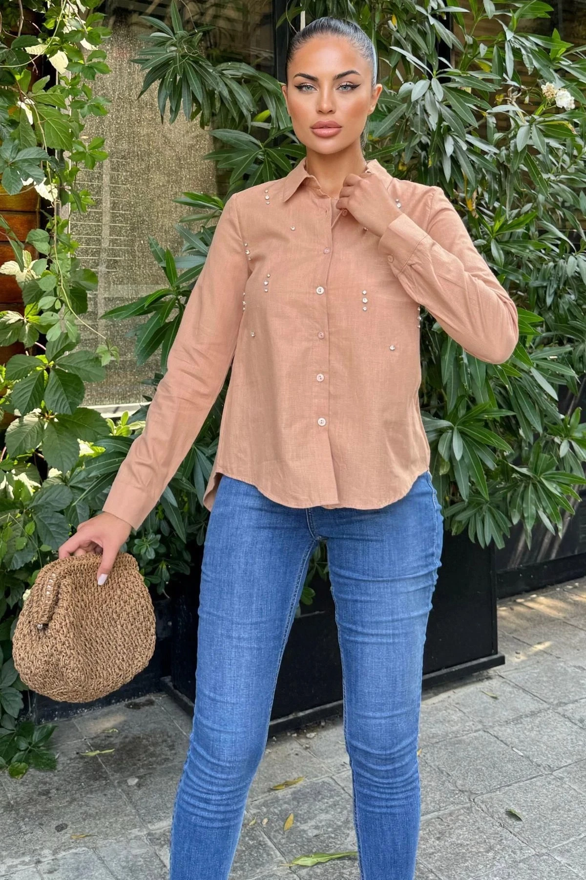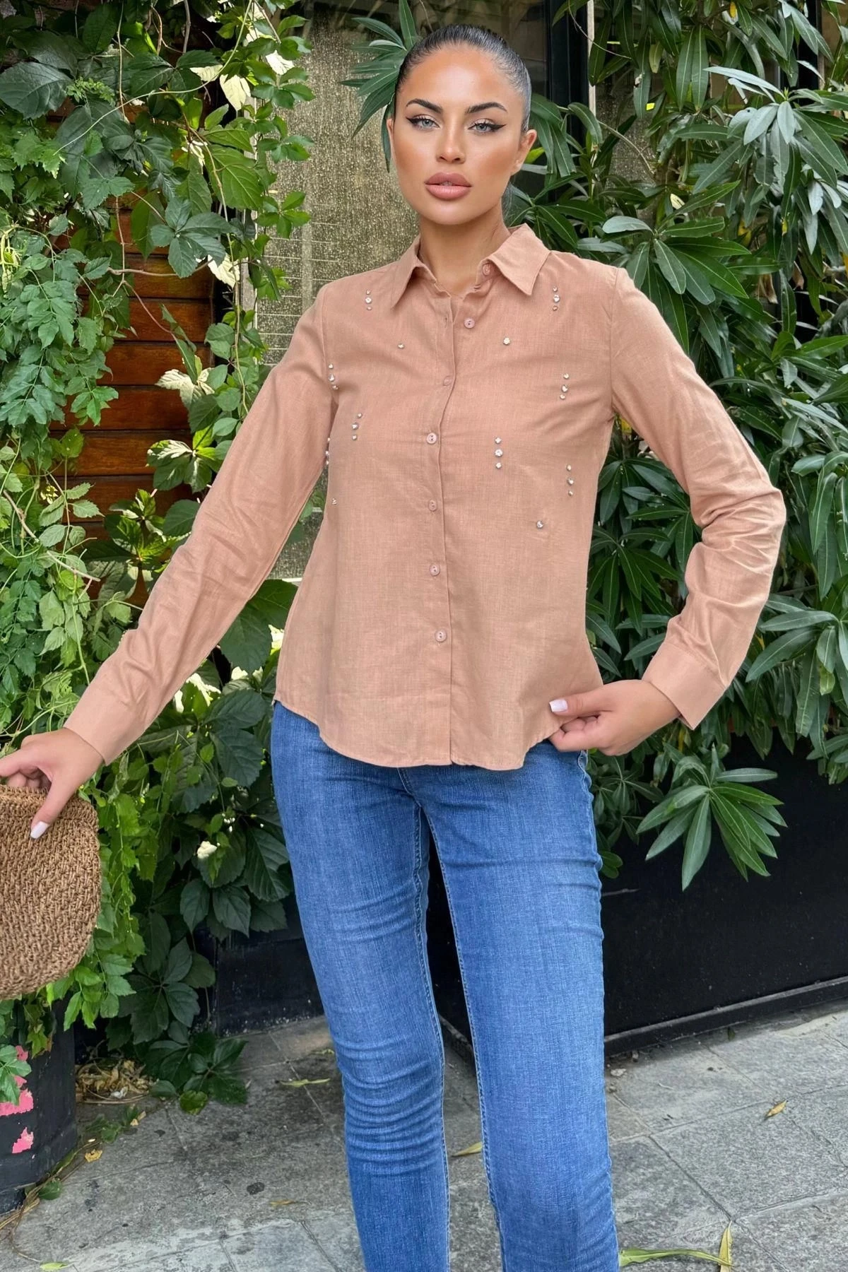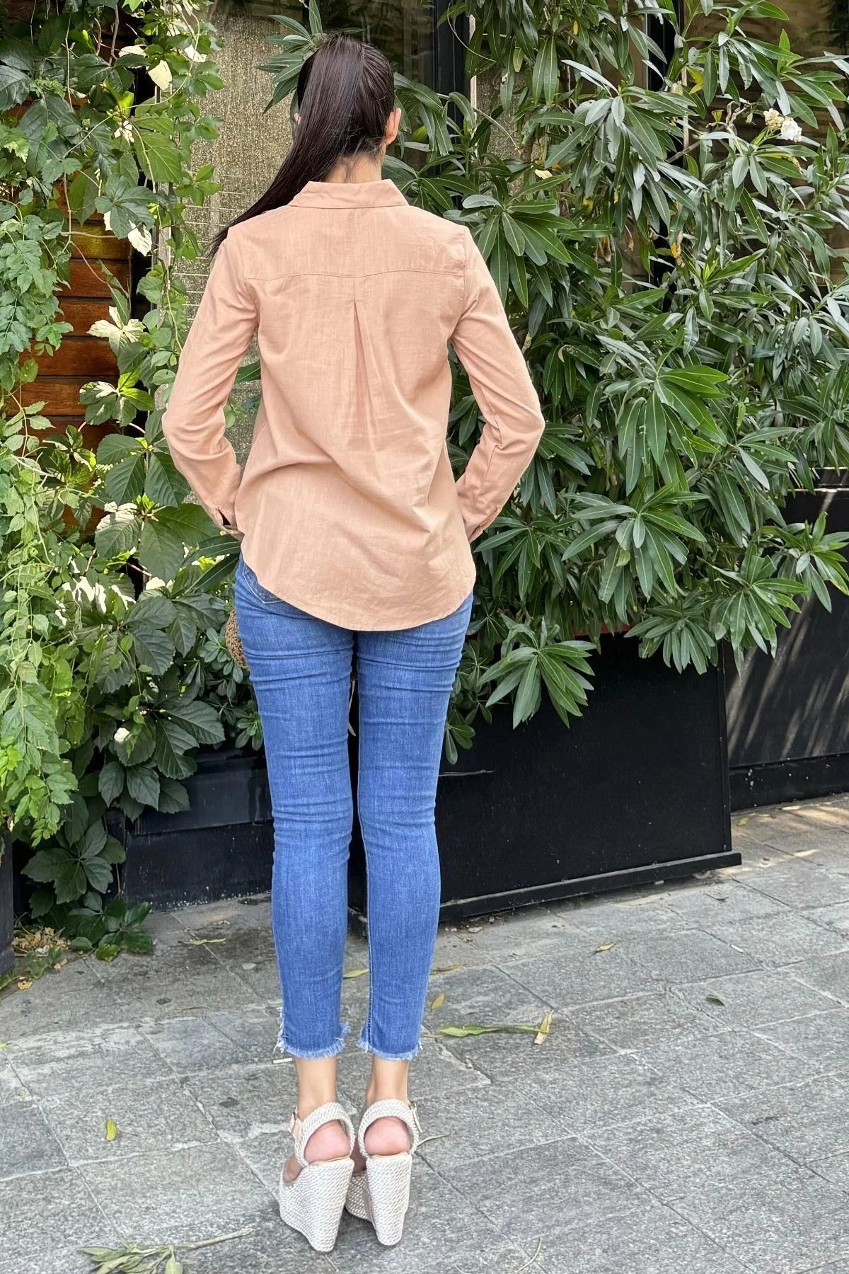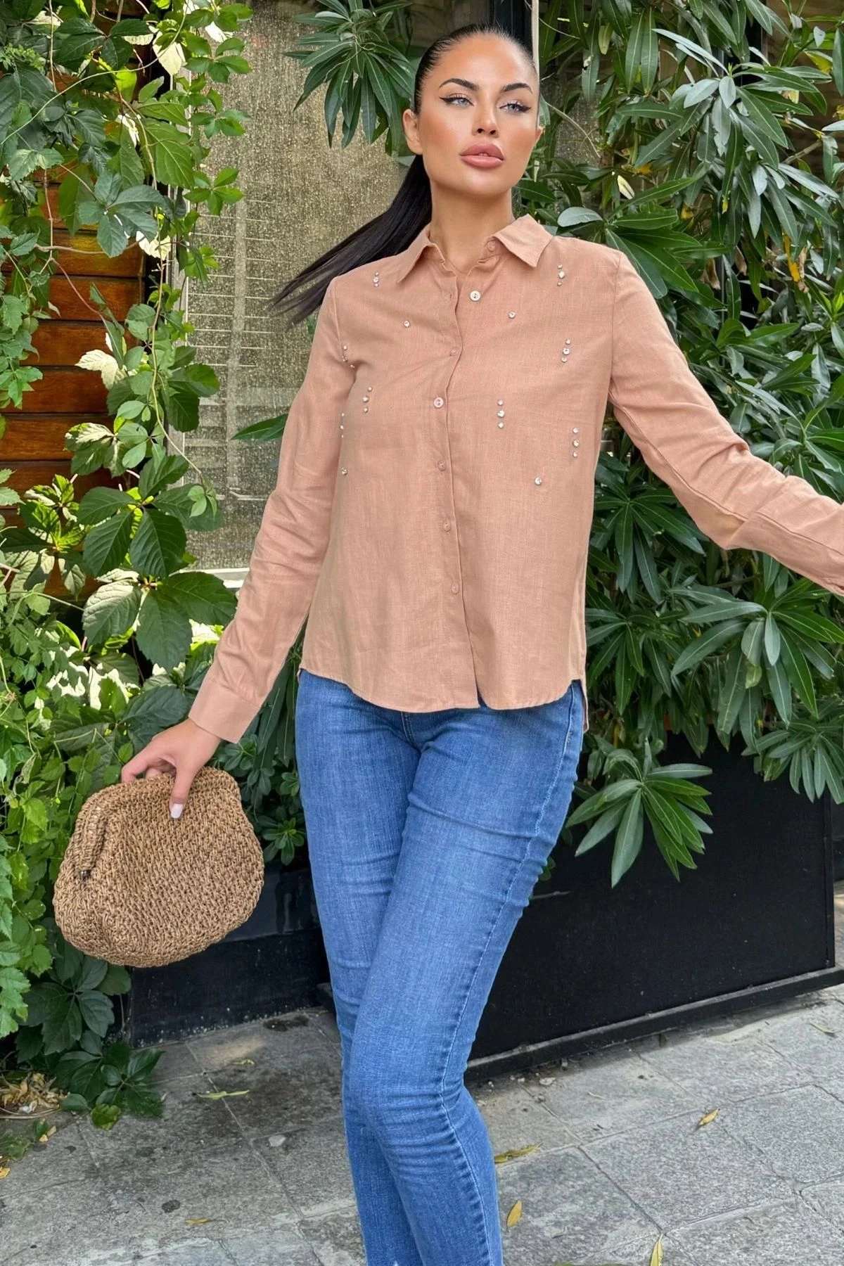Taş Kahverengi Klasik Keten Pamuklu Bluz