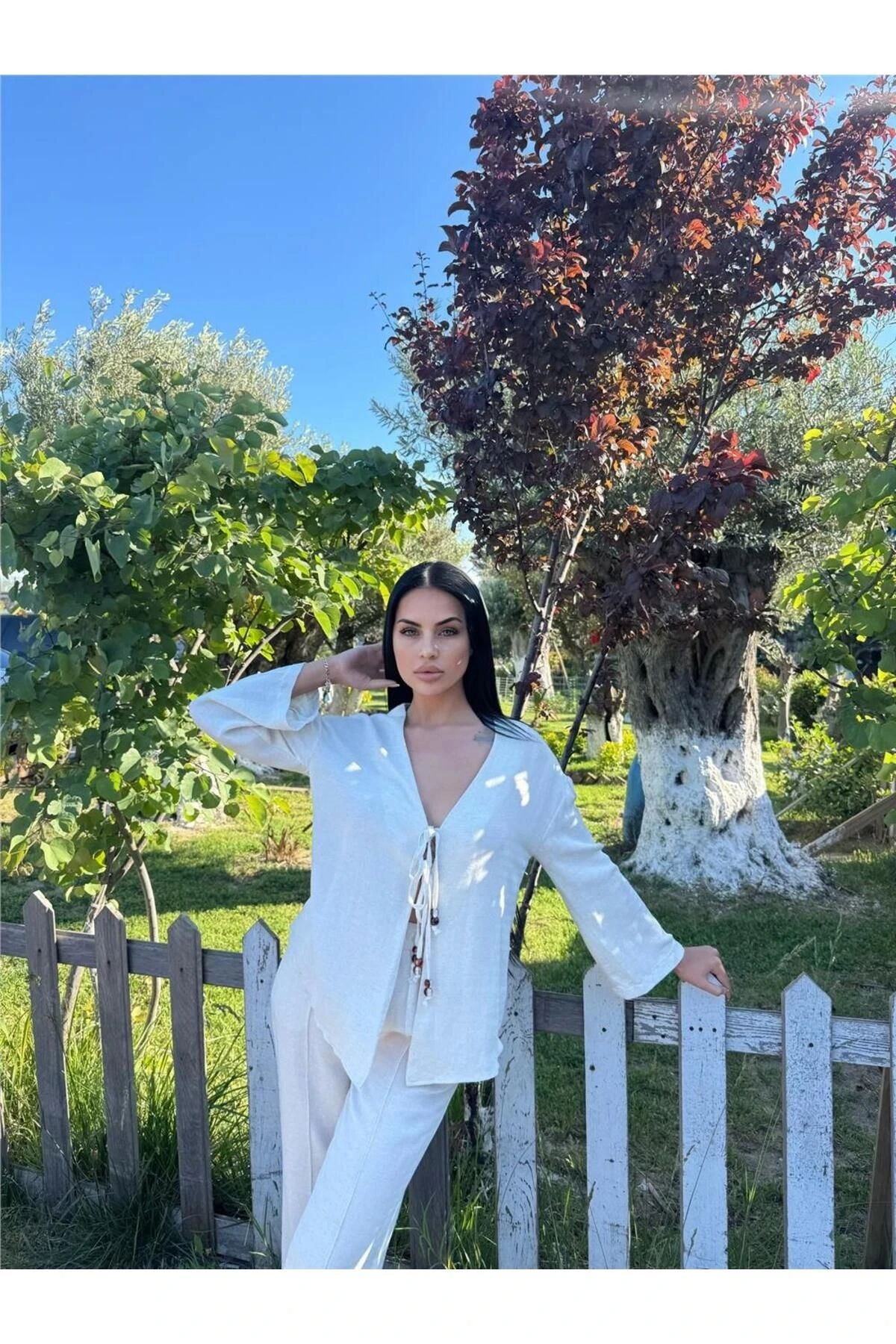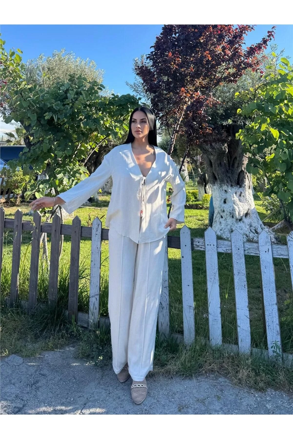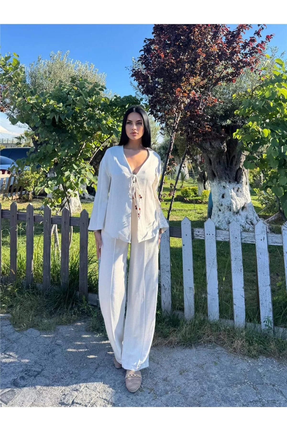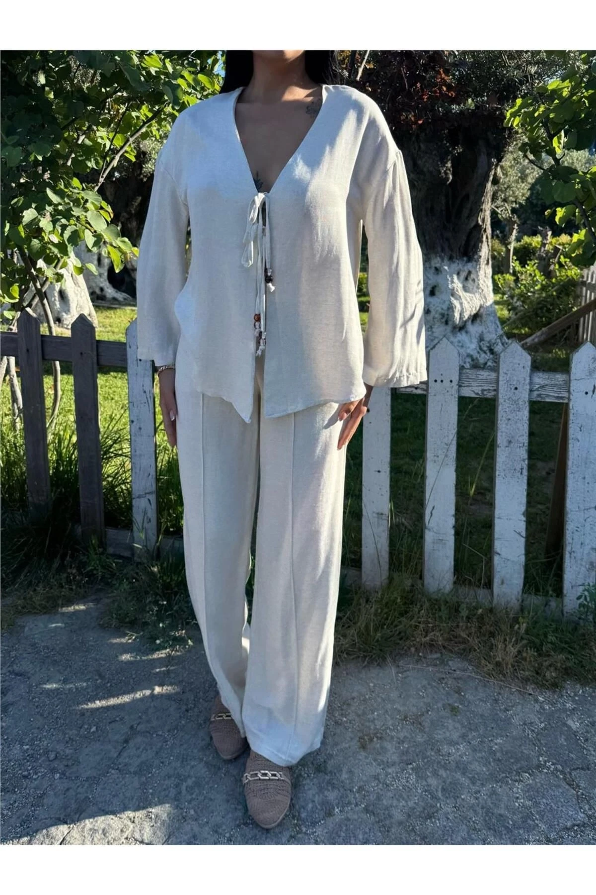 Taş Renk Bağlamalı Saten Kruvaze Takım