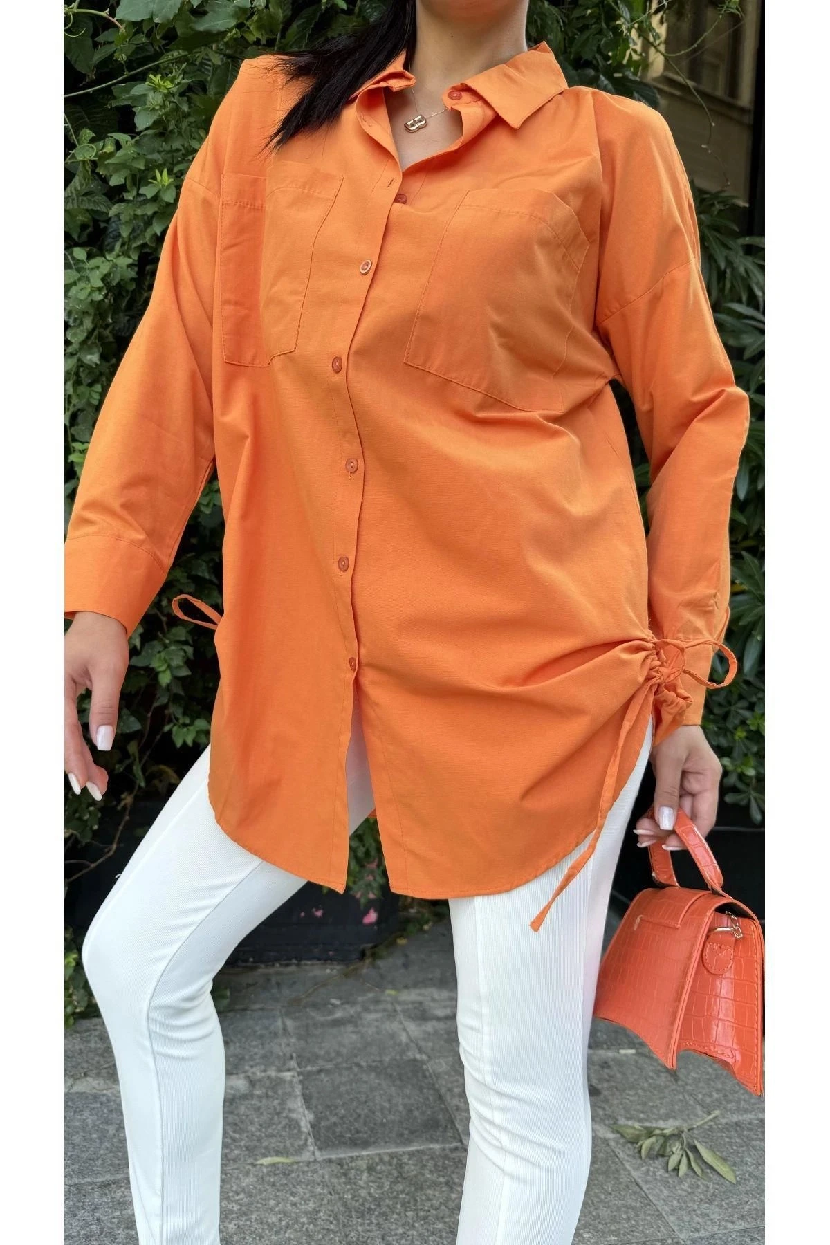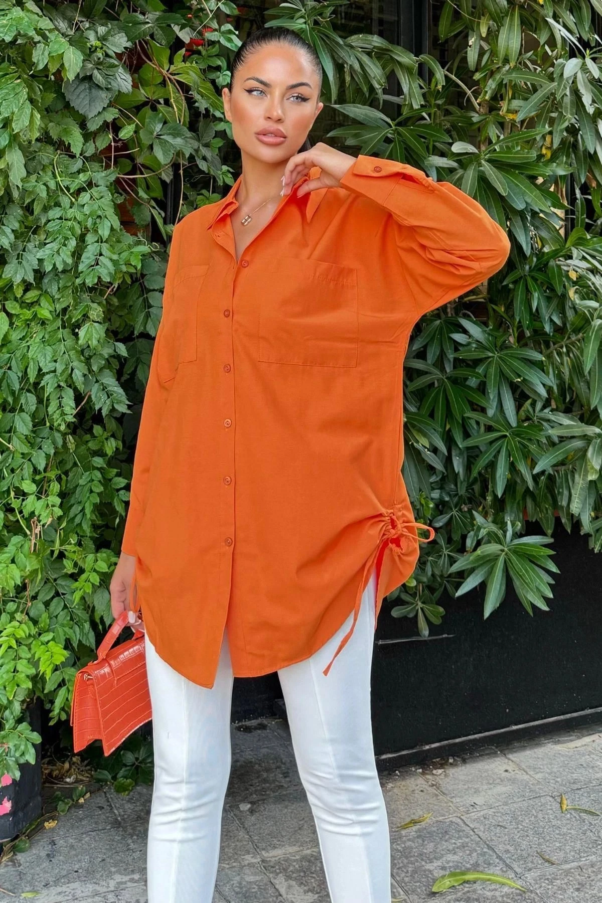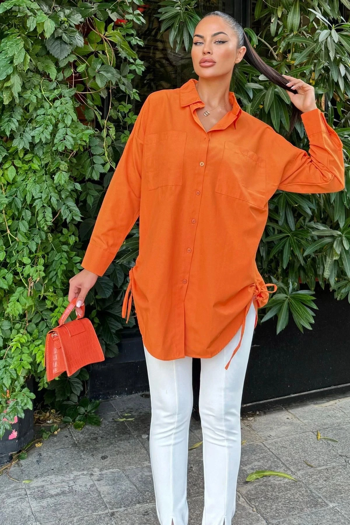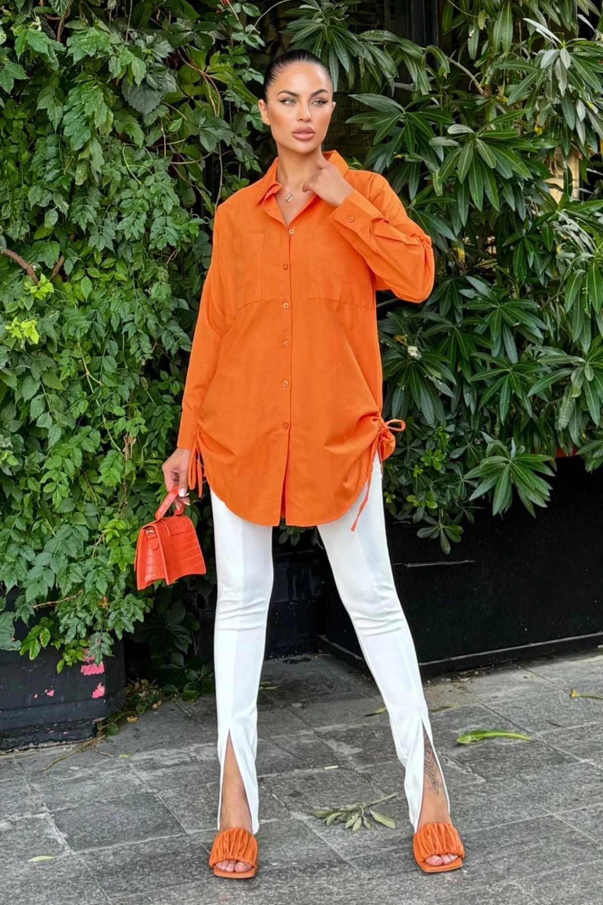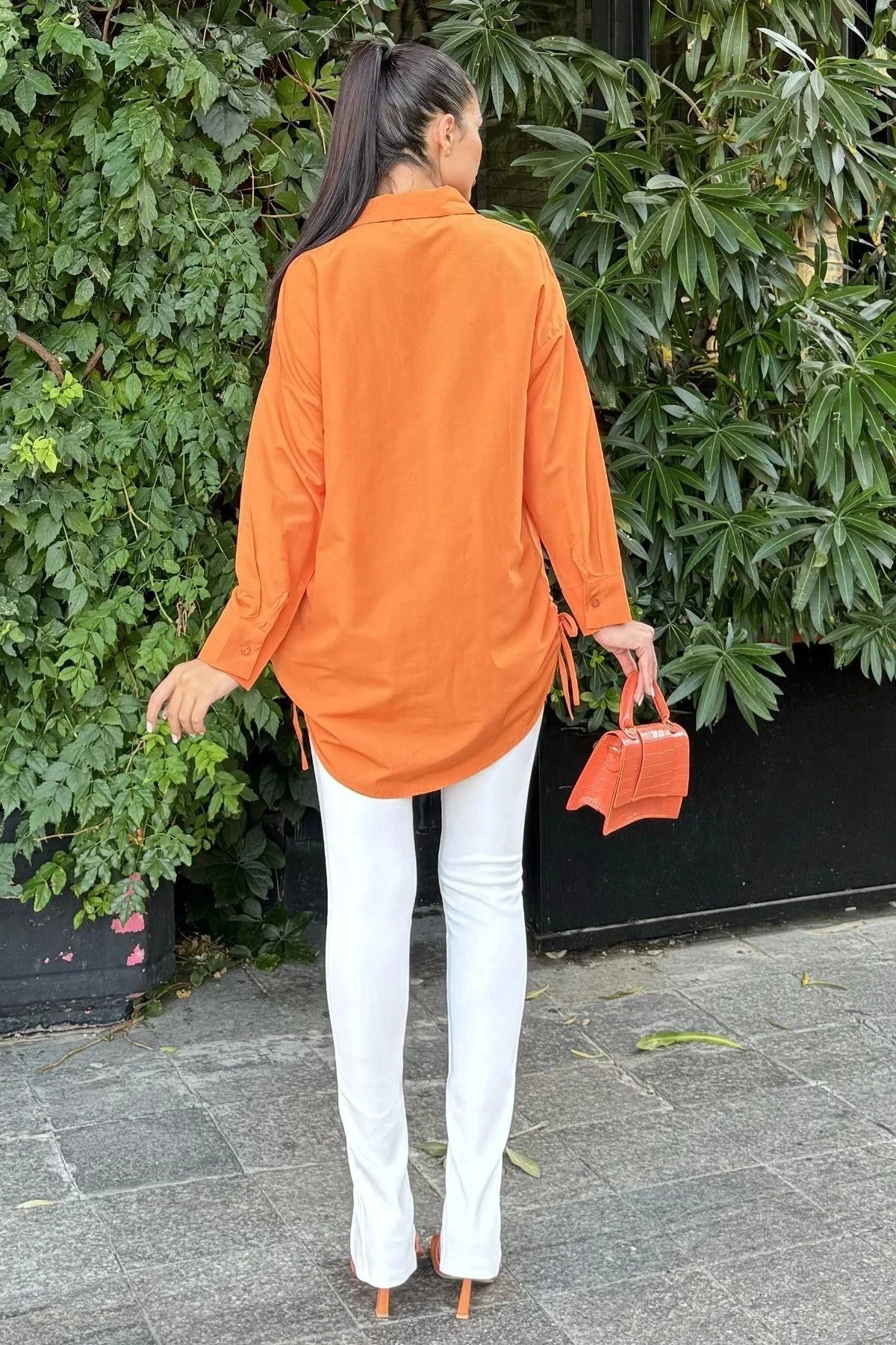 Turuncu Büzgülü Terikoton Oversize Gömlek