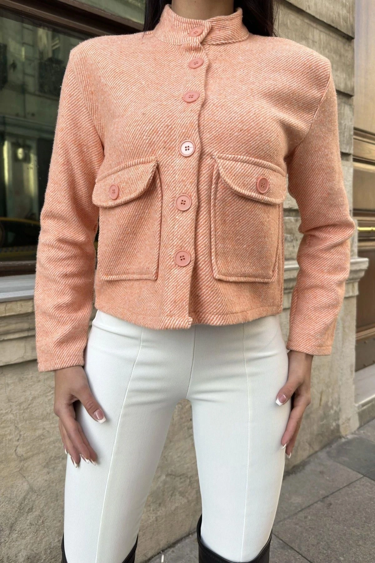 Turuncu Dik Yaka, Çift Kapaklı Cep, Kısa Kesim, Diagonal Kaşe Ceket