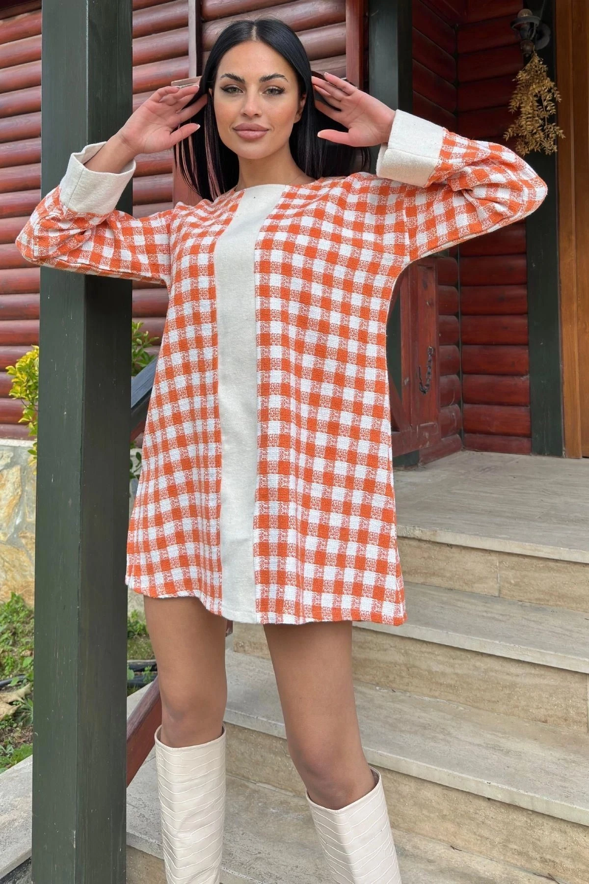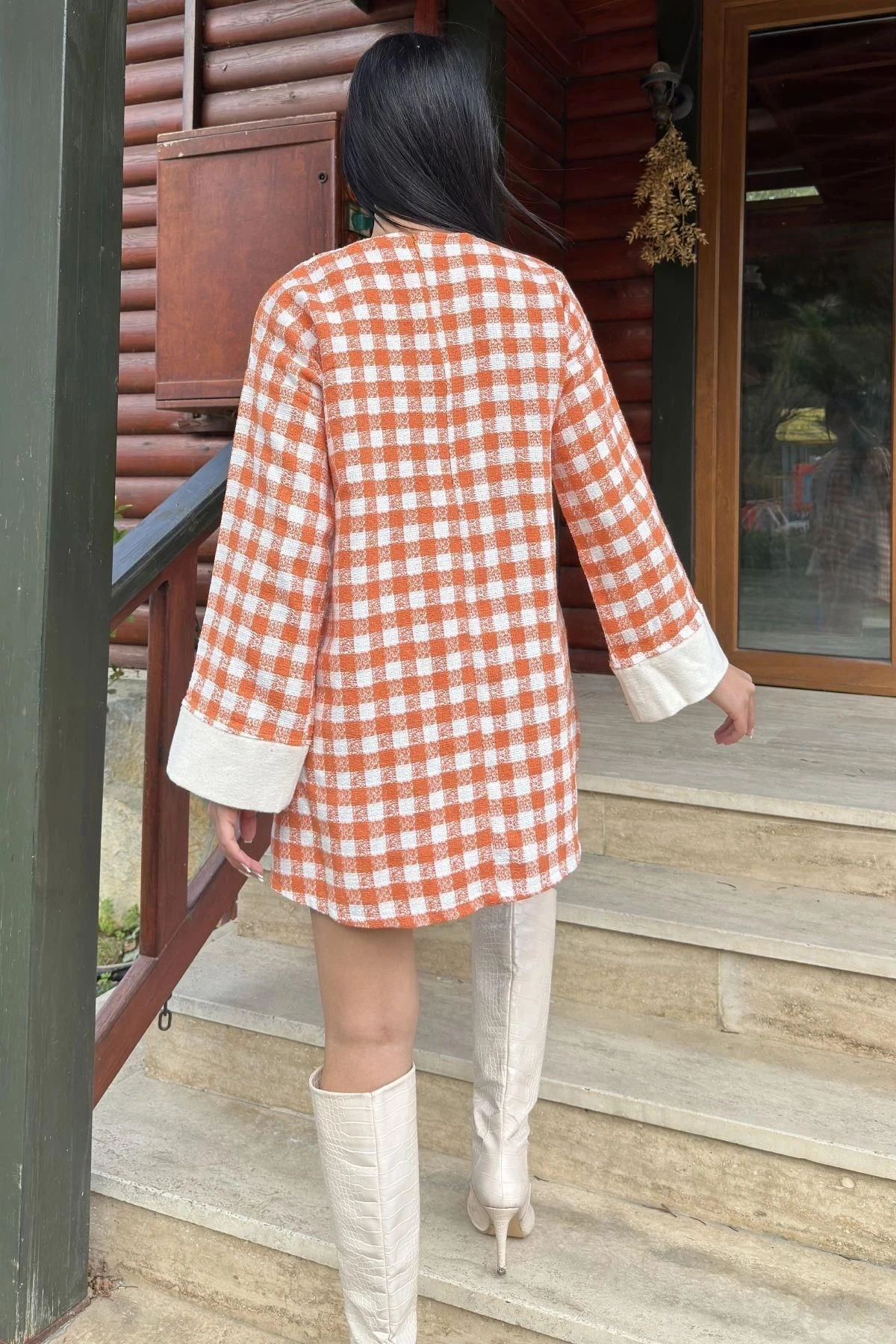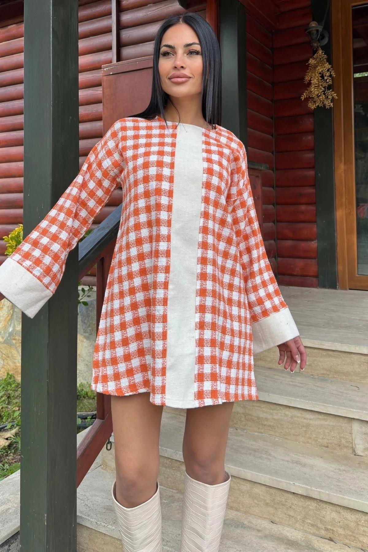 Turuncu Kare Desenli Şanel Kumaş, Geniş Manşet Detaylı, Salaş Midi Elbise