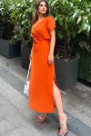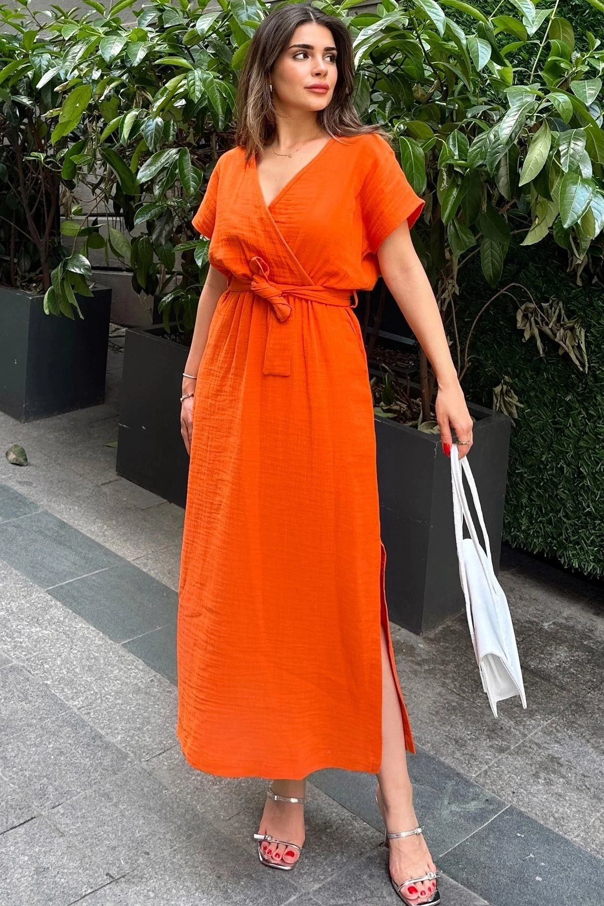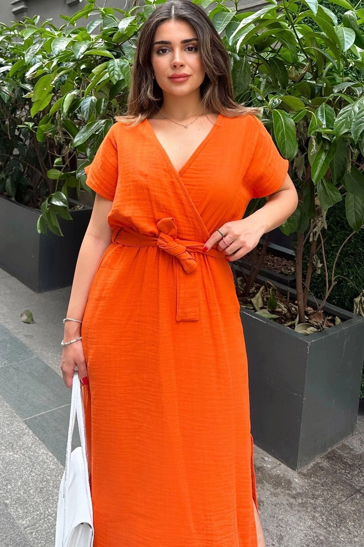 Turuncu Kruvaze Yaka,Yırtmaçlı, Beli Kuşaklı, Terletmez, Pamuklu, İthal Müslin Kumaş, Uzun Elbise