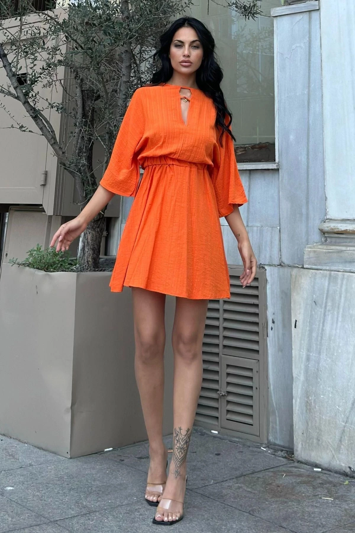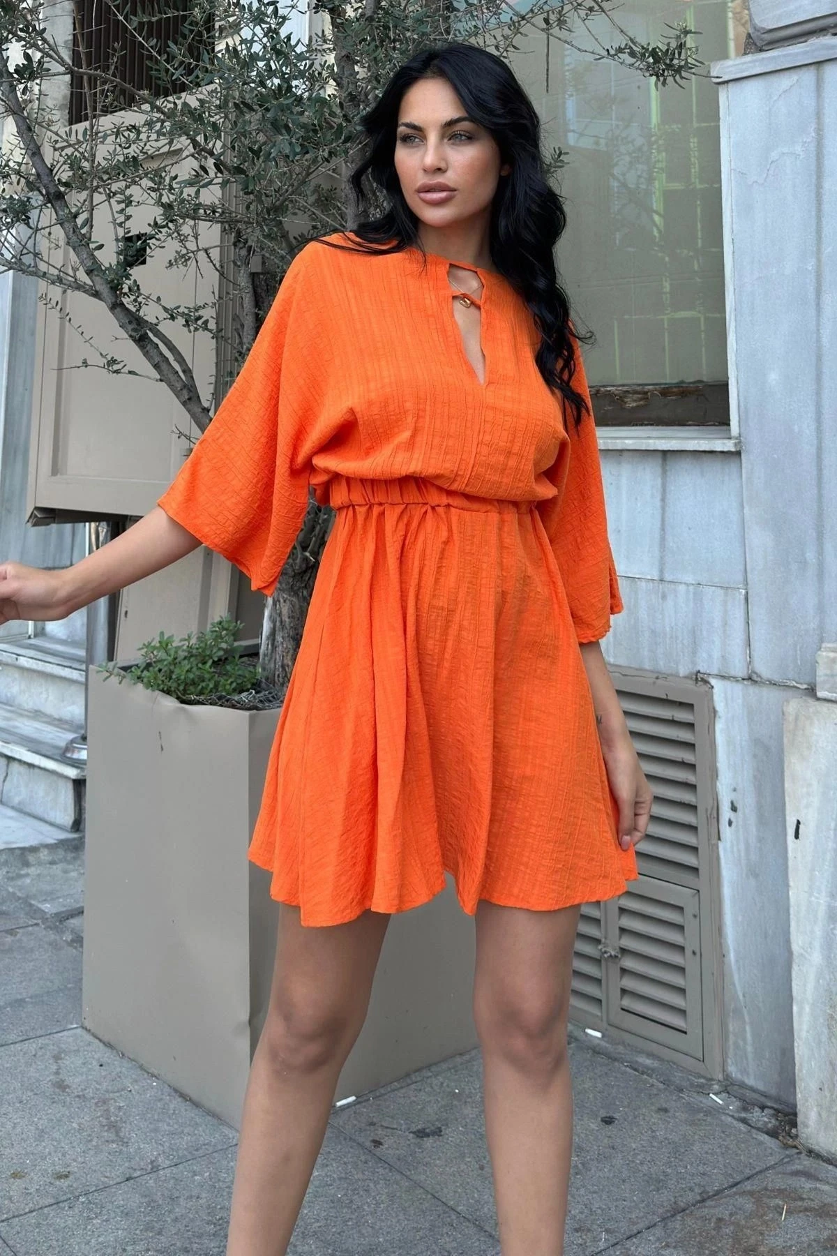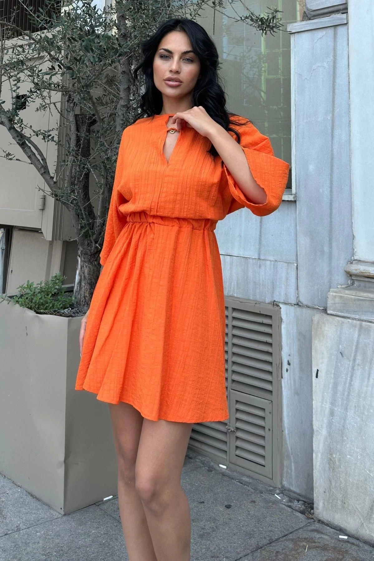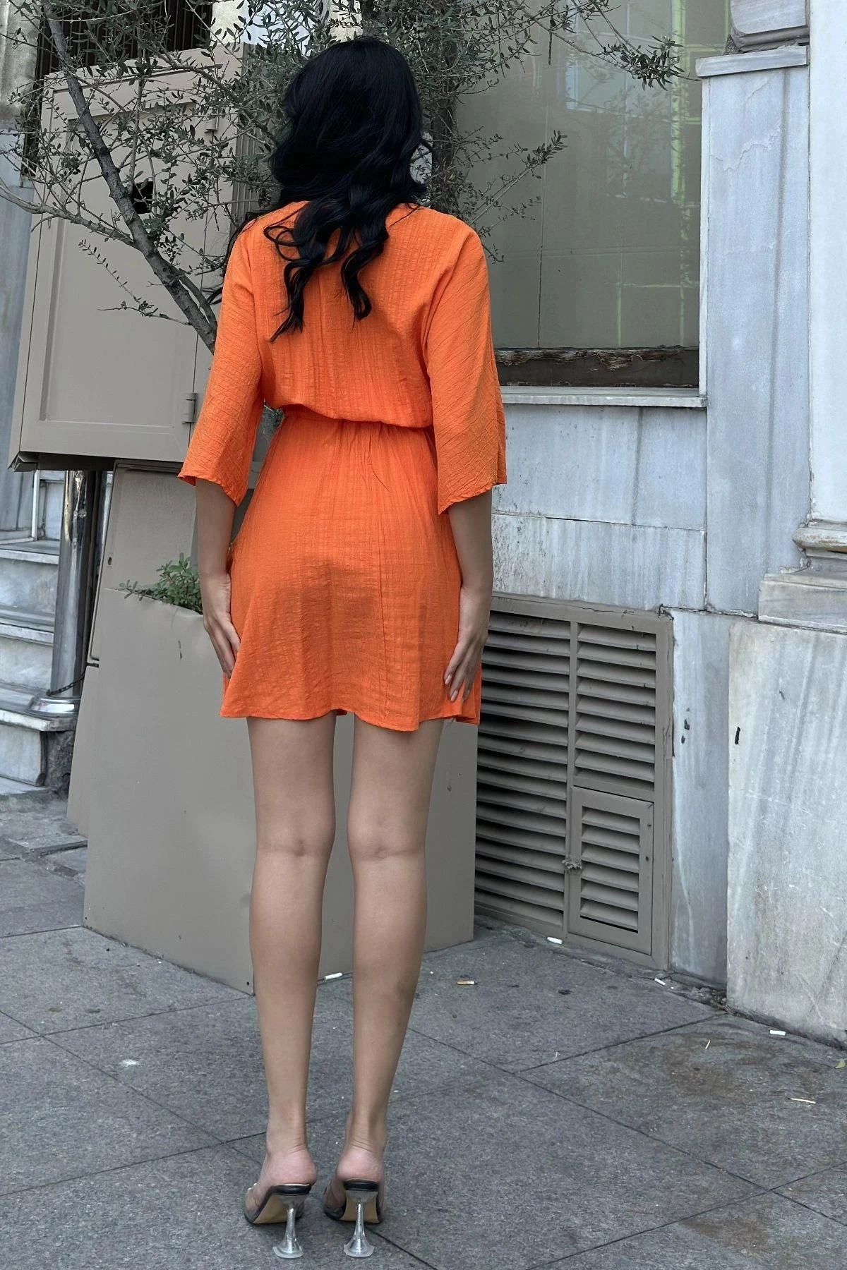 Turuncu Kumaş Yaka Detaylı Kloş Elbise