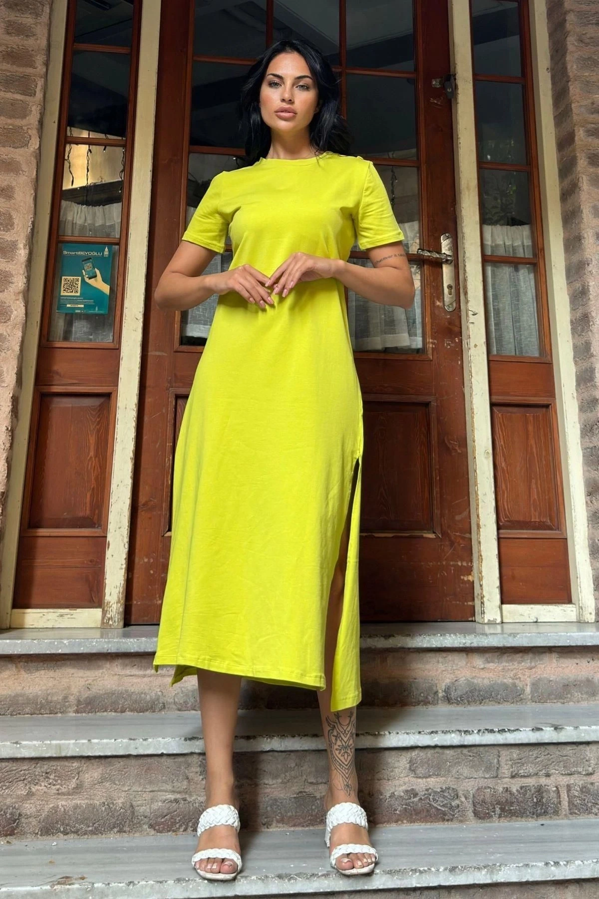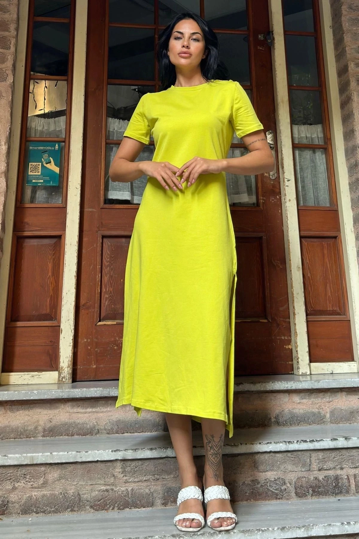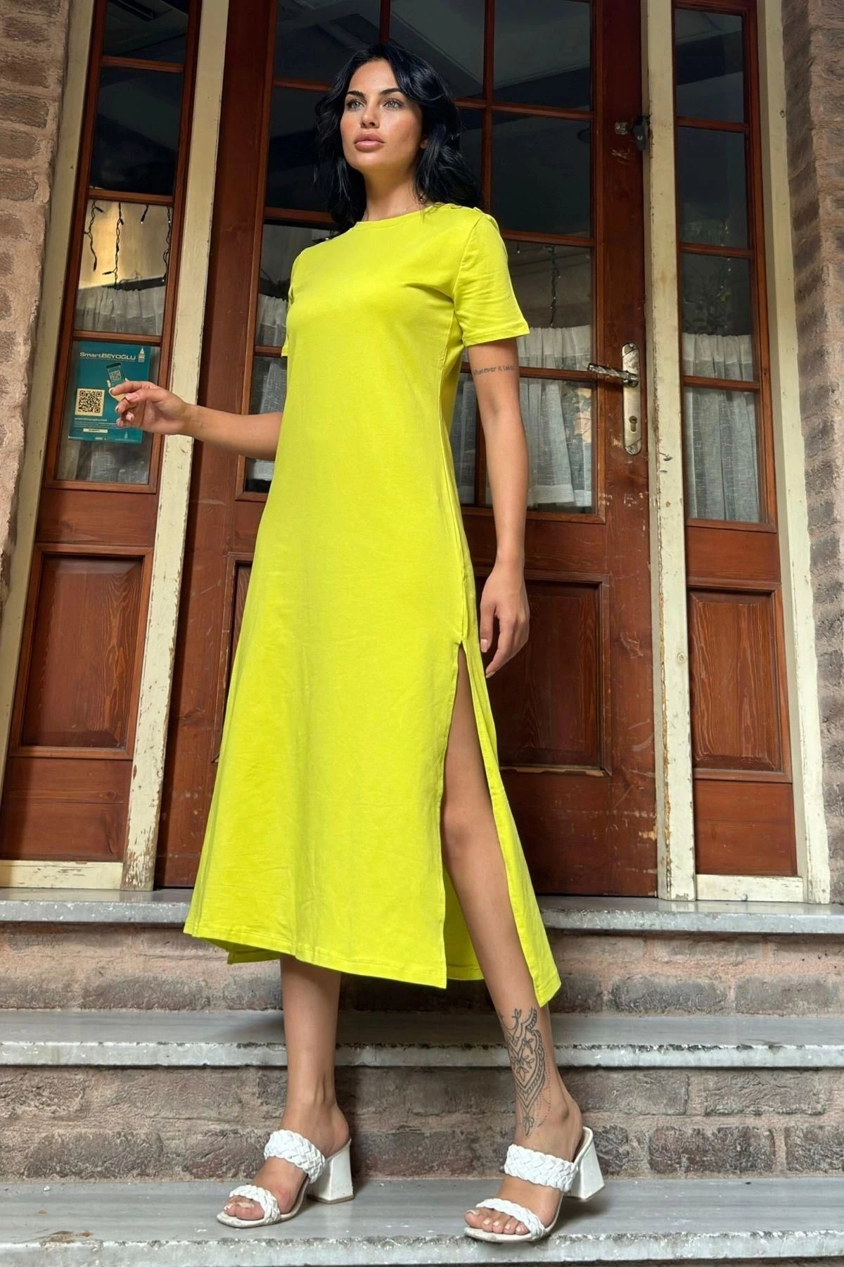 Yağ Yeşili Düğmeli Yırtmaçlı Uzun Elbise