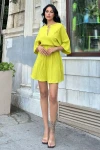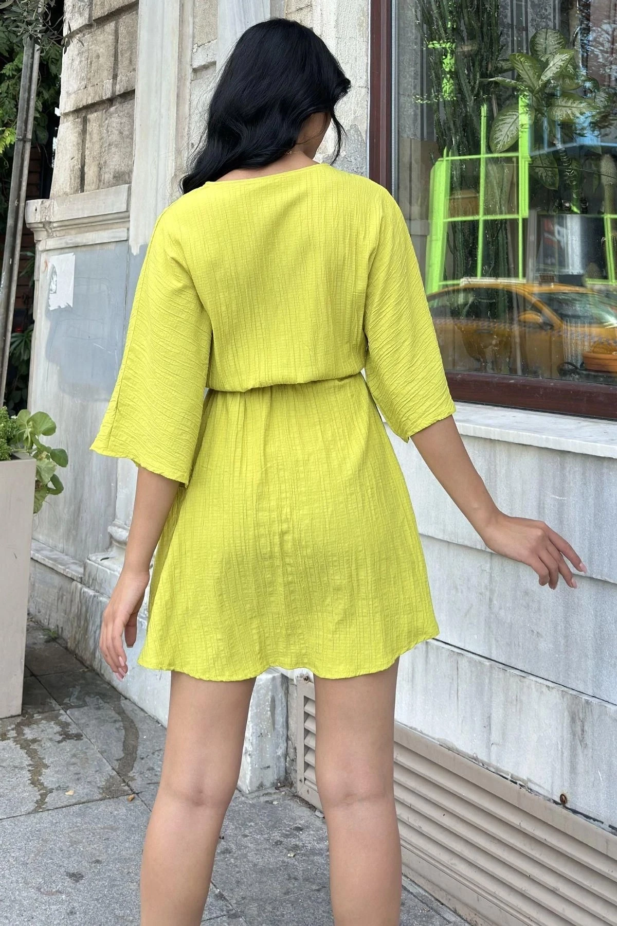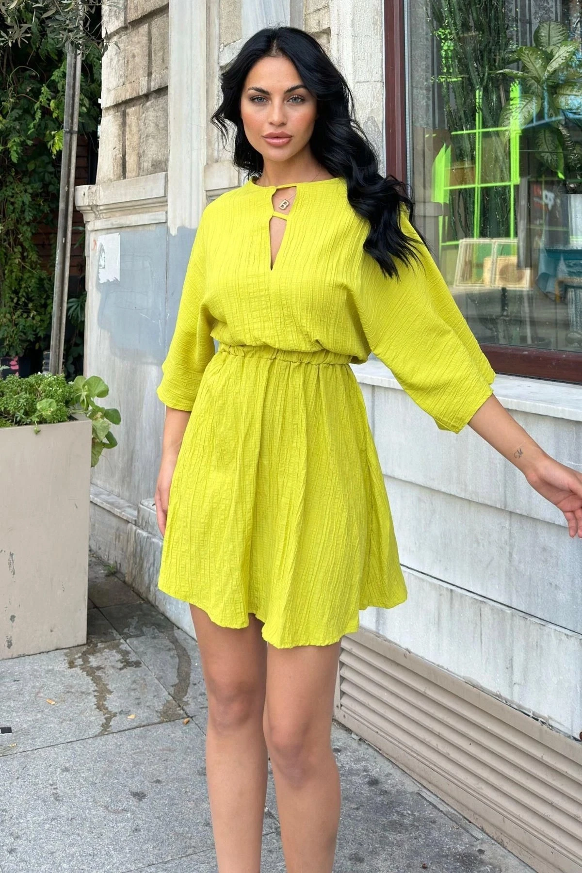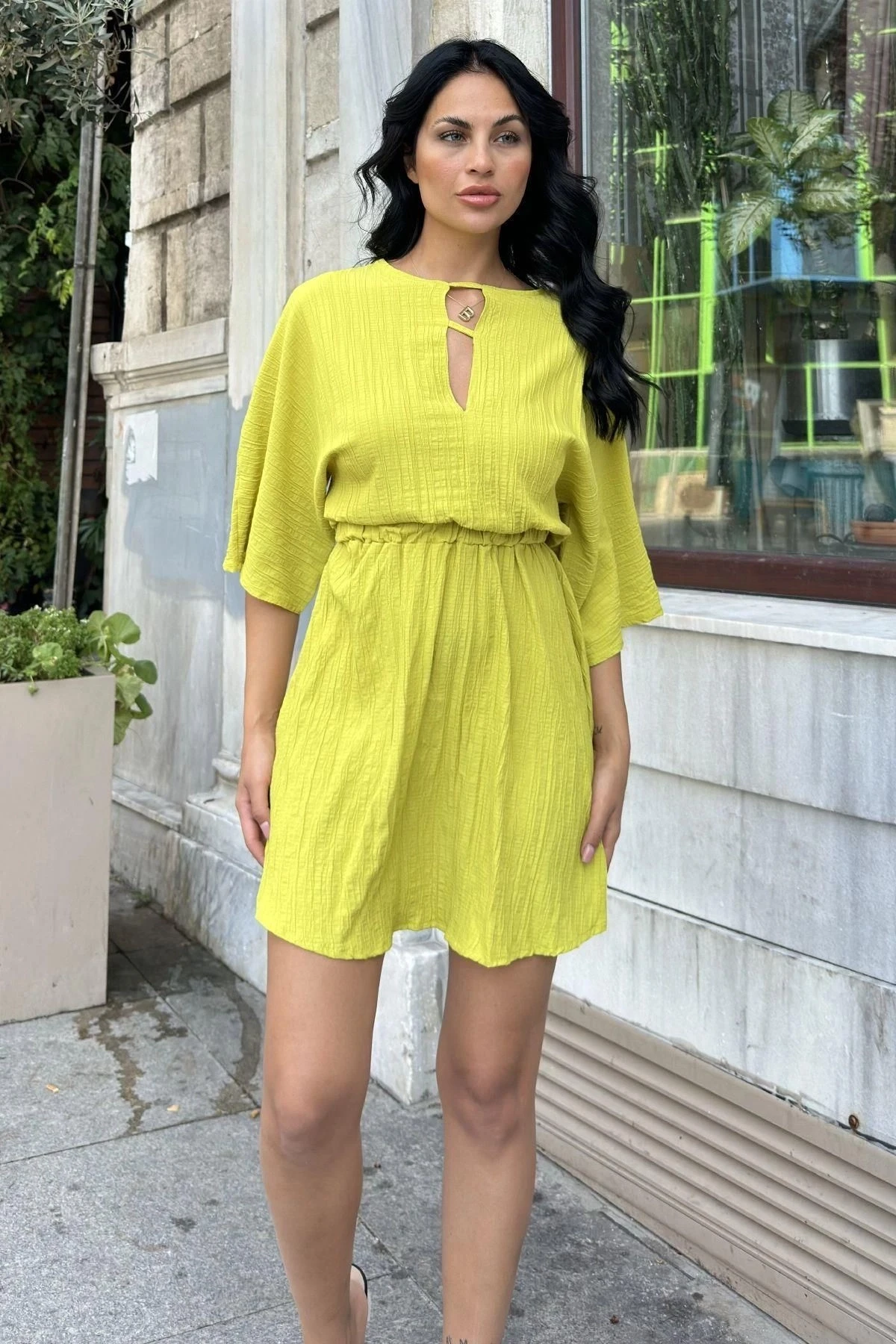 Yağ Yeşili Yaka Detaylı Lastikli Kloş Elbise