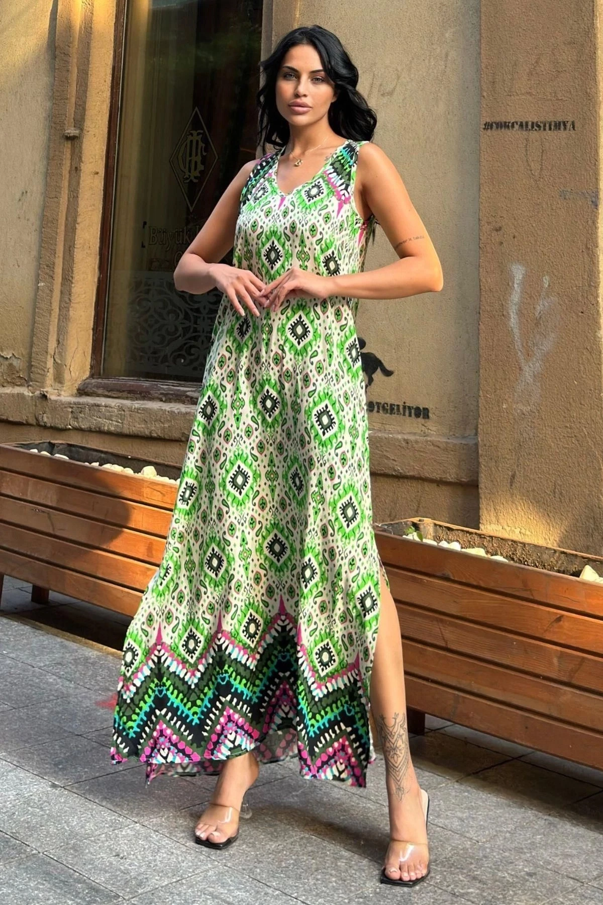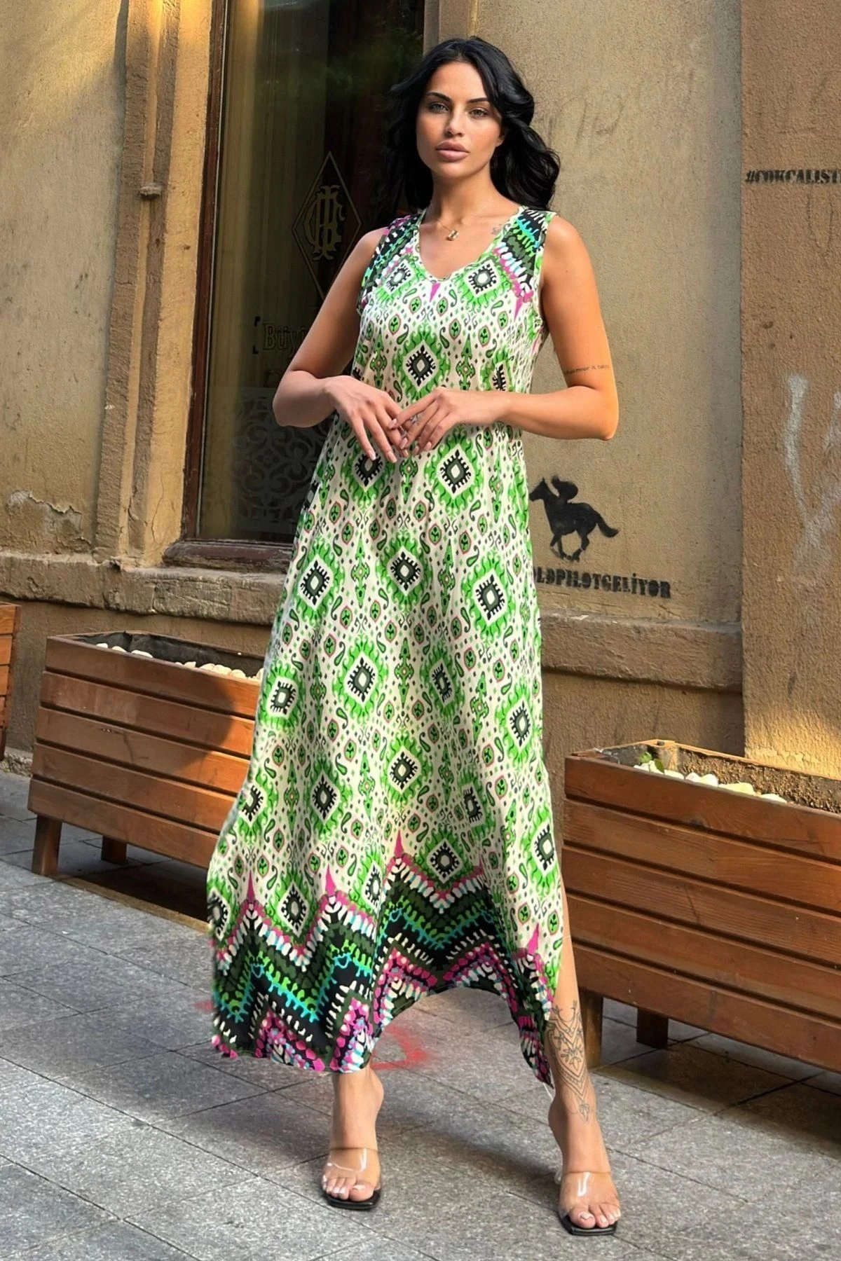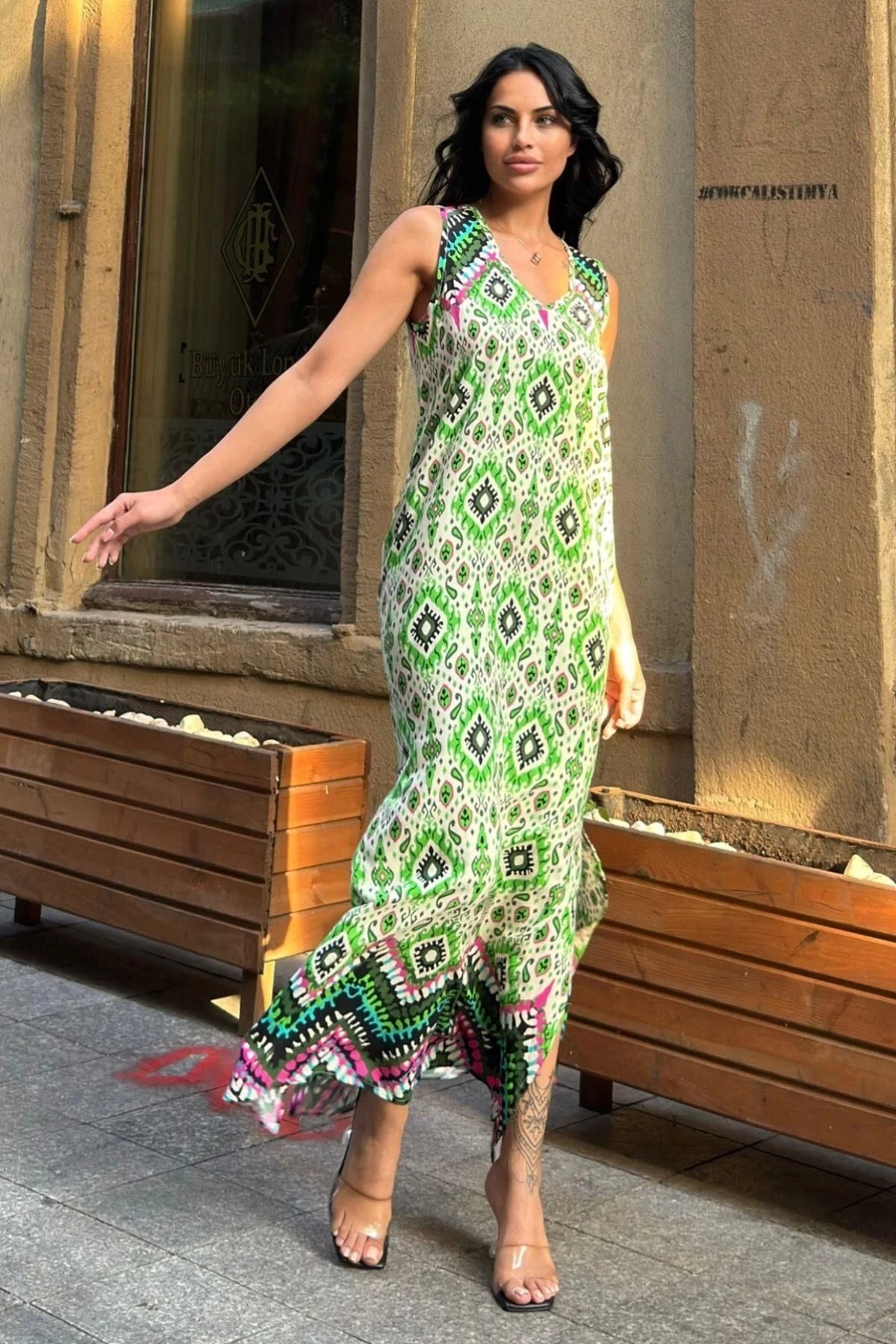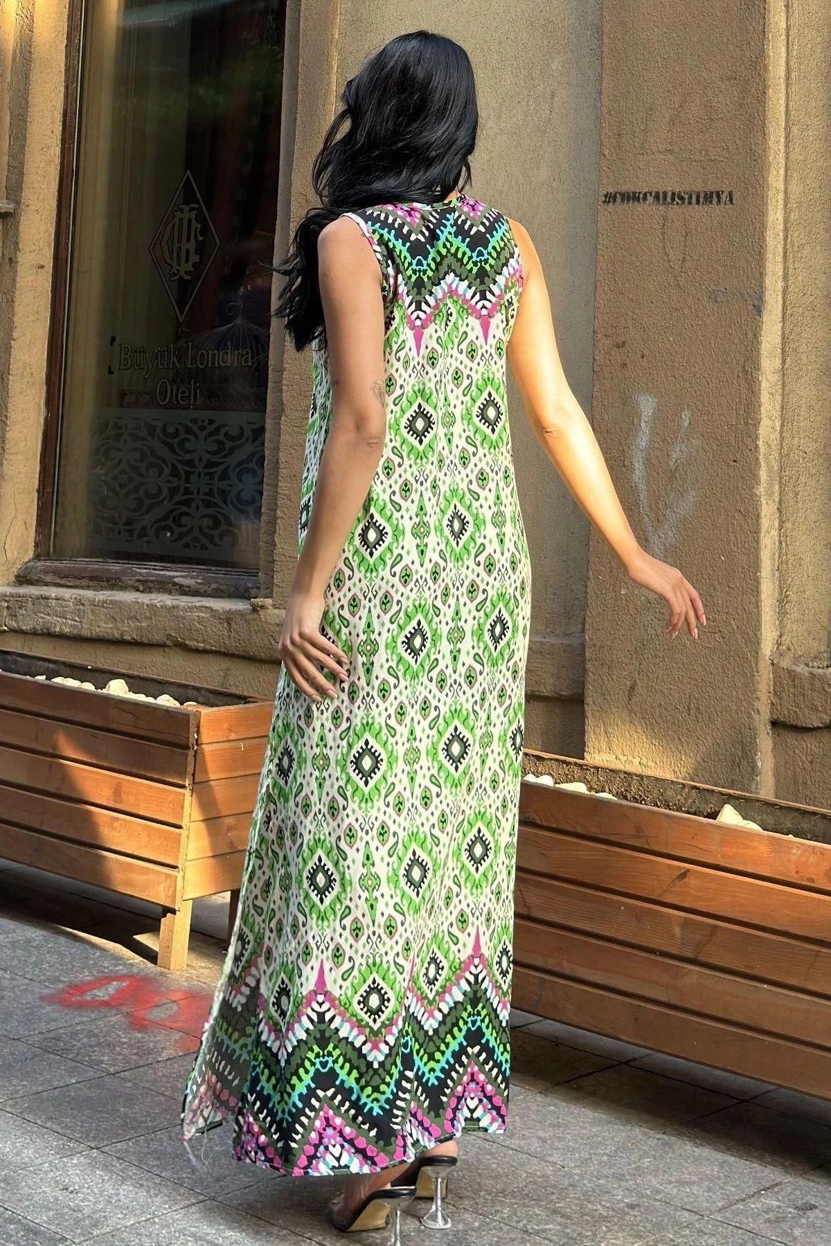 Yeşil Etnik Desenli Maksi Viskon Uzun Elbise