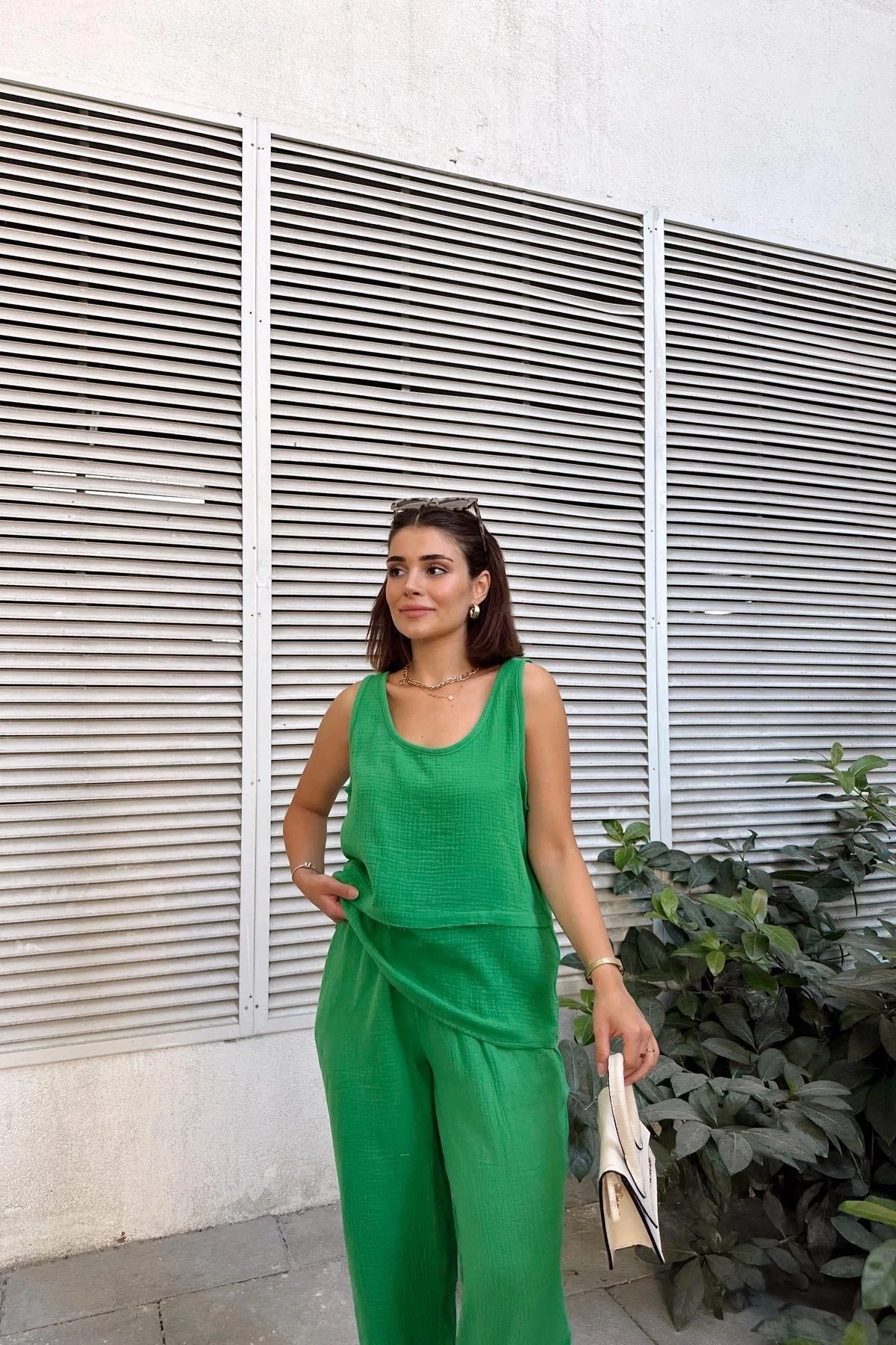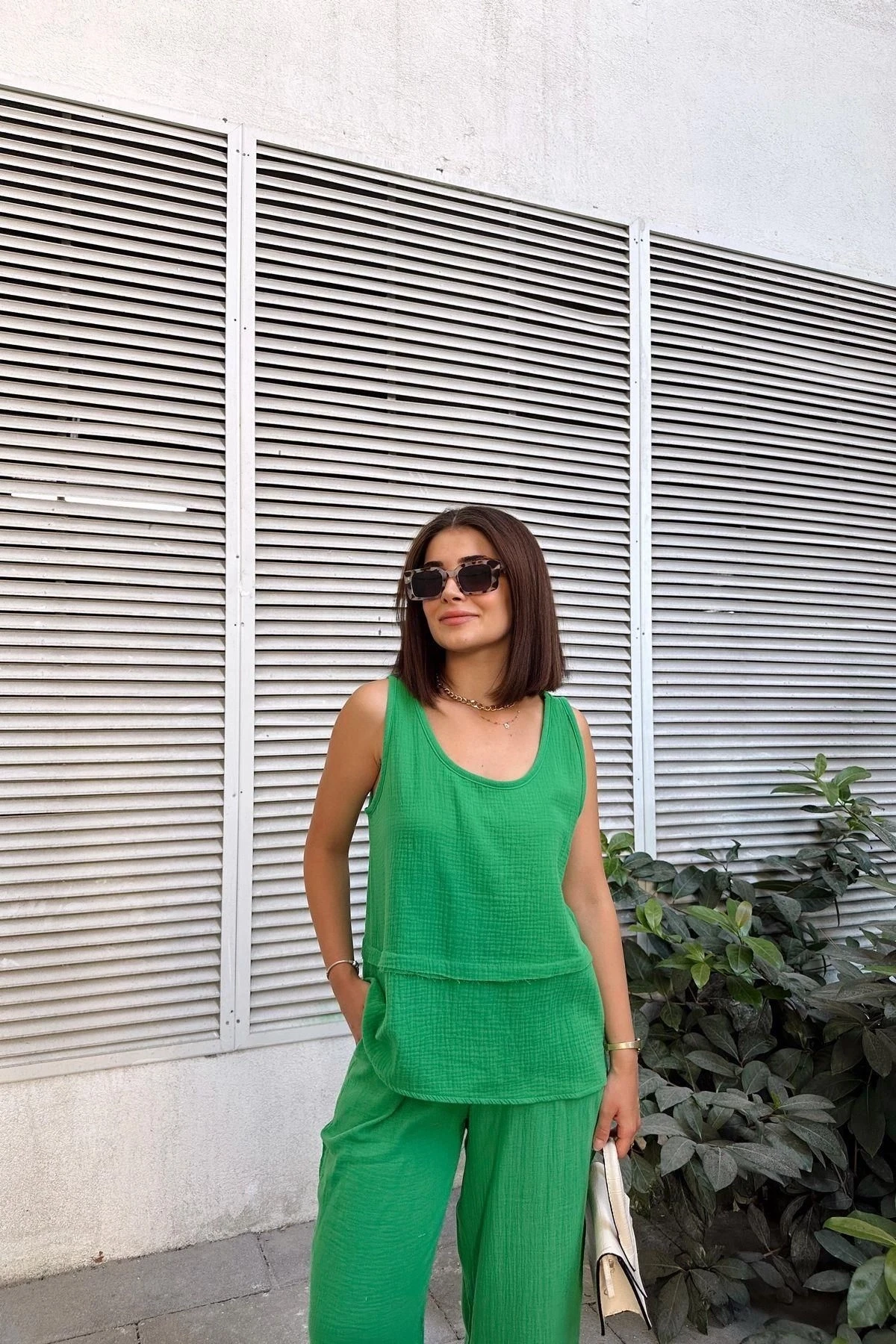 Yeşil İthal Müslin Kumaş, Basic, Katlı, Salaş Askılı Bluz & Atlet