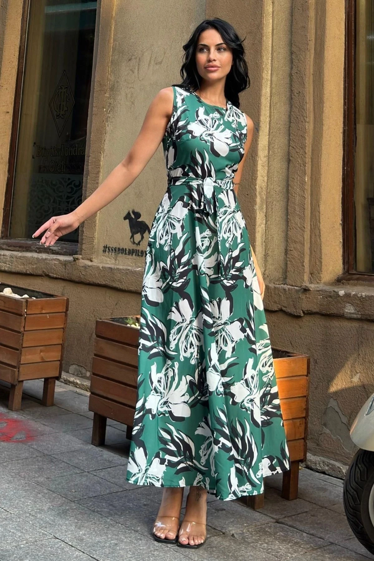 Yeşil Krep Kuşaklı Uzun Elbise
