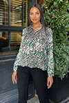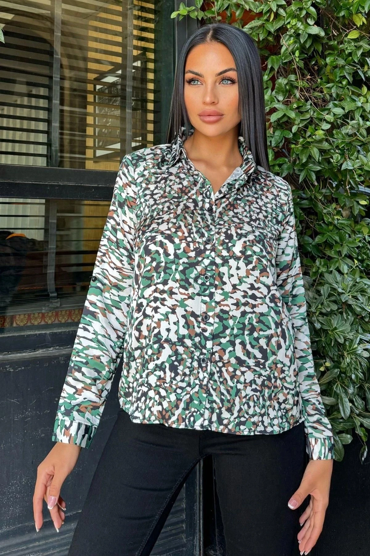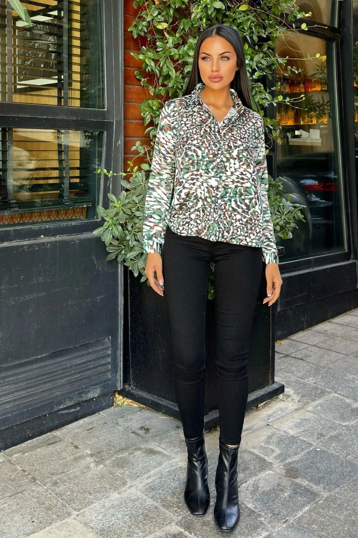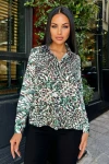 Yeşil Leopar Desenli, Uzun Kol, Klasik Kesim, Saten Gömlek