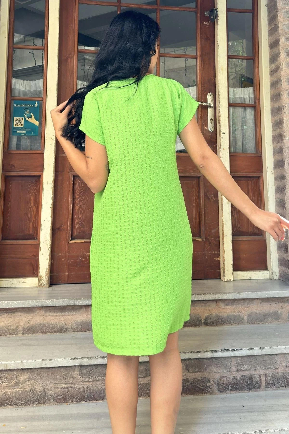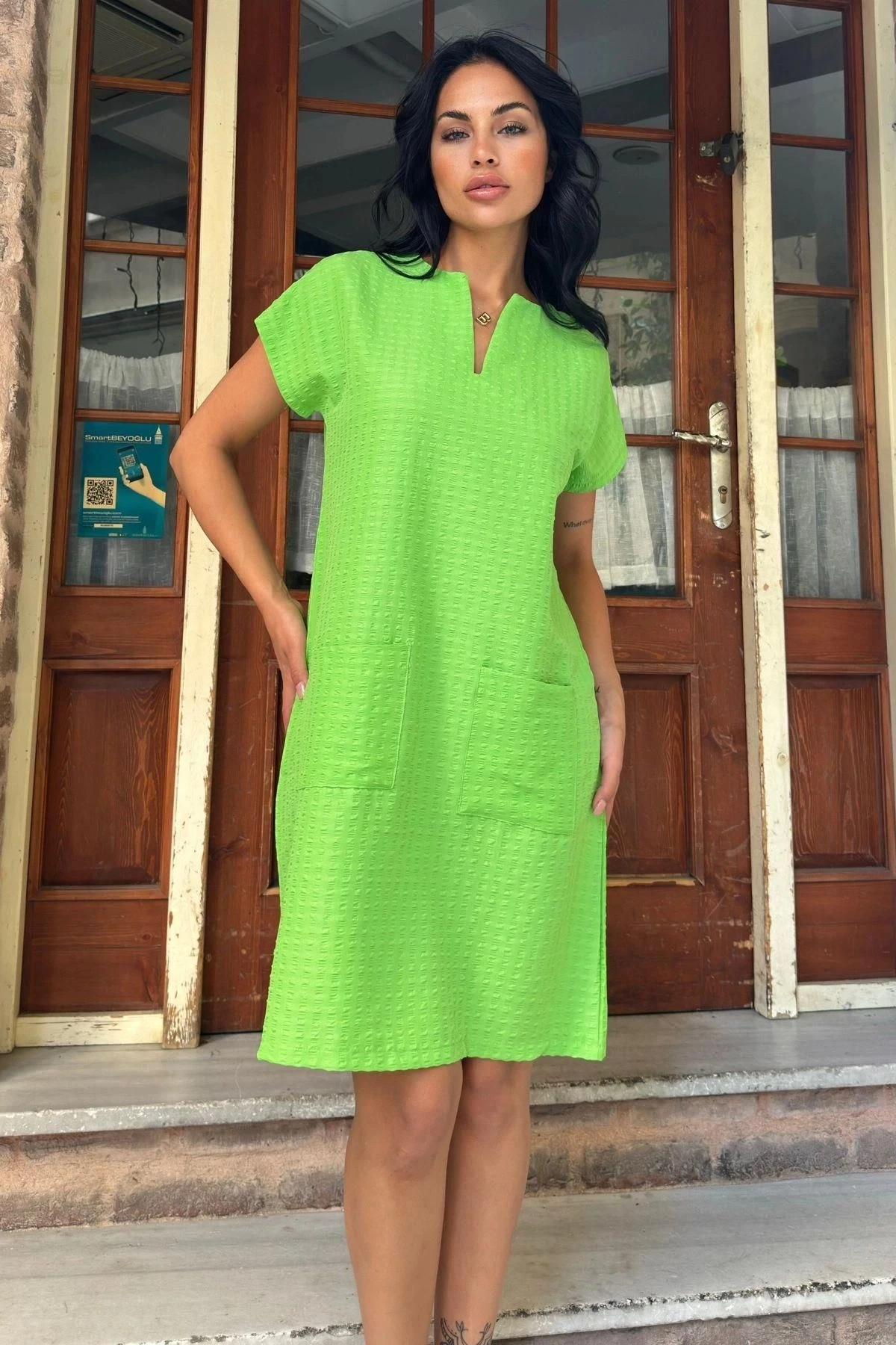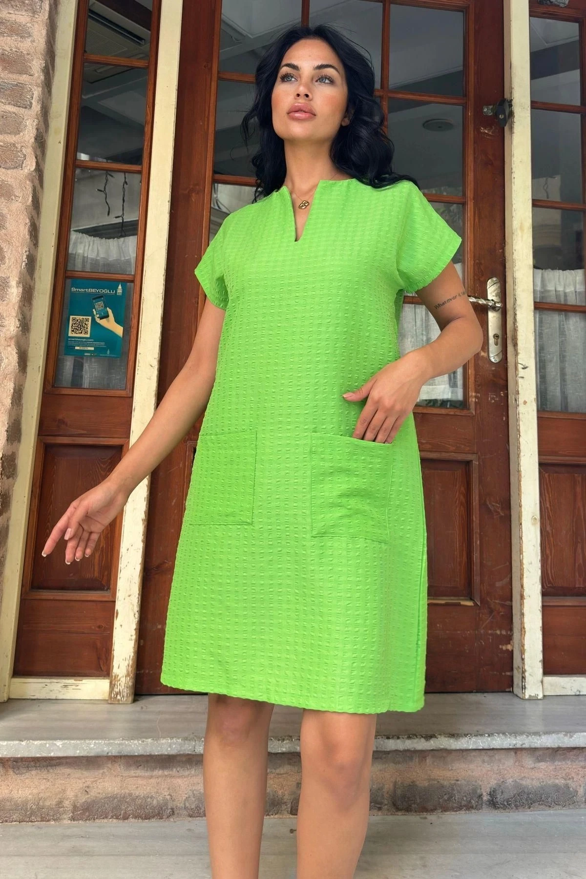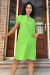 Yeşil Lotus Kumaş Cep Detaylı Rahat Midi Elbise